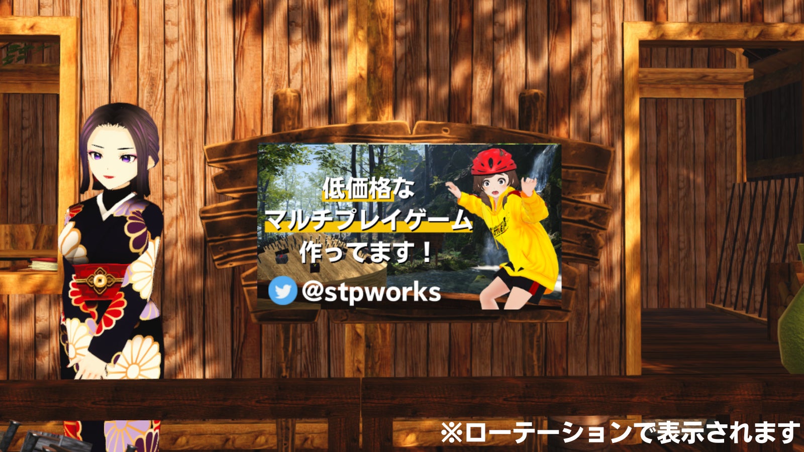 ゲーム内の案内看板のバナーやテキスト広告枠では、このようにご自身のSNSアカウントの宣伝も可能となっています!