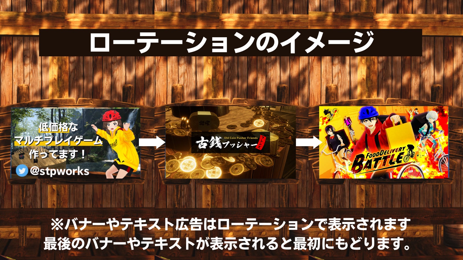 添付画像の用にローテーションで表示されます。2箇所の広告スペースには同じ内容が表示されます。2箇所に同じ内容を表示する理由は、1箇所ですとゲームプレイによっては映らなくなるなるため2箇所に表示しております。