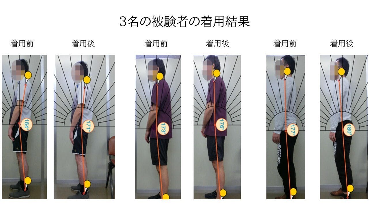 3名の被験者の着用結果を数値化。「THE BALANCE」の着用後、背筋が伸び、姿勢をサポートしていることが確認されております。
