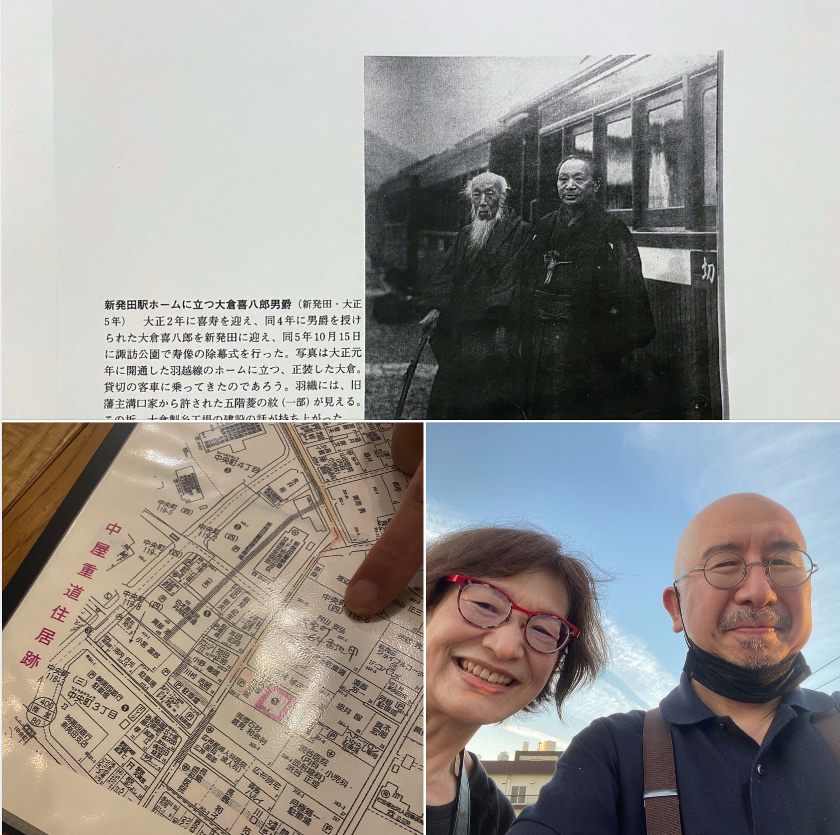 日曜日の事ですが、めちゃ面白い経歴を持たれる現代美術家・笠木絵津子さんが来館。熱闘トーク4時間。笠木さんの新発田に来た目的はルーツ探しったときは本当に驚きました。!なんと、お爺さまは、新発田出身の中屋重道!資料を見ると大倉喜八郎と一緒の写真があったりして! なんでも、重道は土佐藩士、戊辰戦争後、新発田を気に入って住んだとかいう話。ちょうど撮影に来られた佐藤泰彦先生にお見せしたら、重道は原公平の次の次くらいの町長だったのではないかと、、。またまた、面白くなってきました。