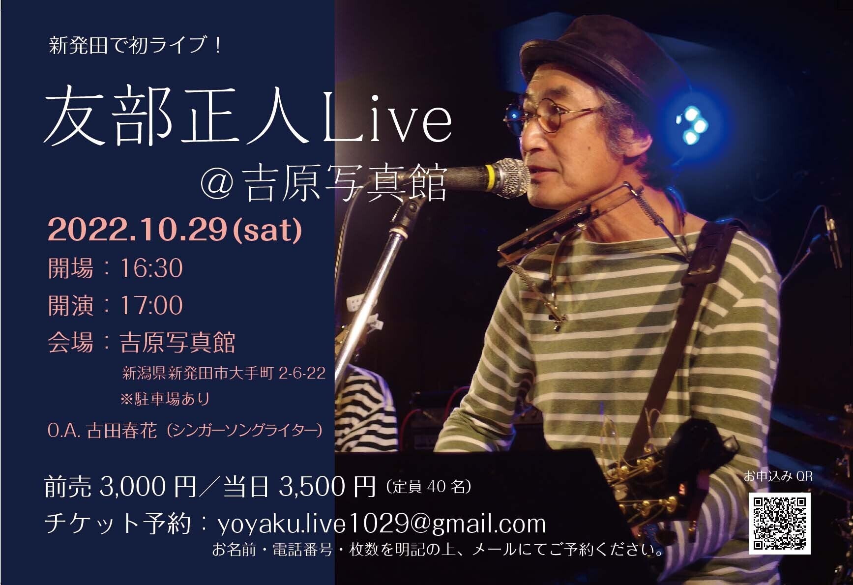 10月29日に伝説のフォークシンガー友部正人さんのライブを開催いたします。お知らせし即日半分売れました。残りは20席です。お早めにどうぞ。
