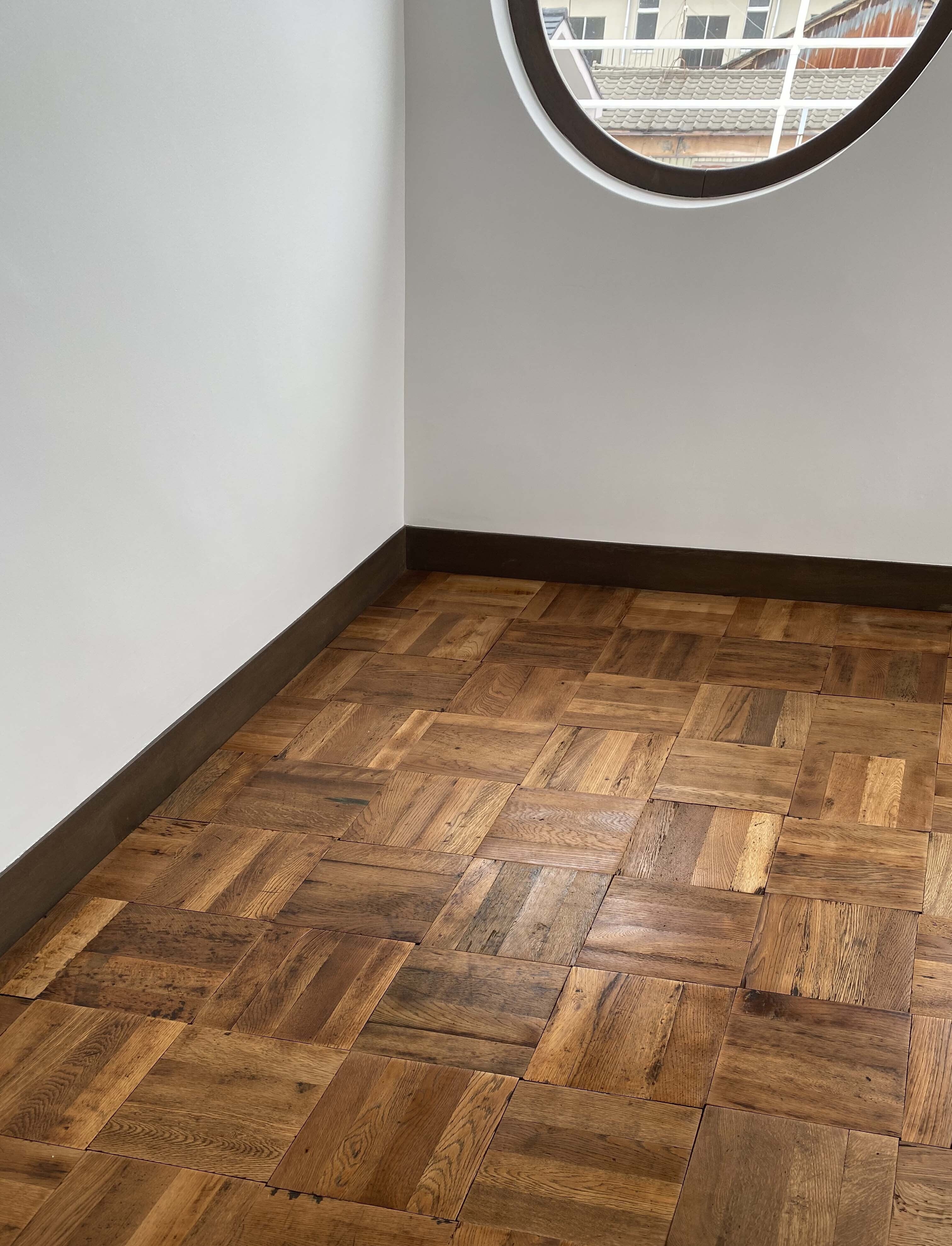 3階ギャラリー/漆喰ギャラリー/メモリーズの床の写真をシェアいたします。。この床板は、3階の屋根裏に大切に保管されていたスタジオのオリジナル床板だと思われます。まるで、このギャラリーのために残してあったように感じました。