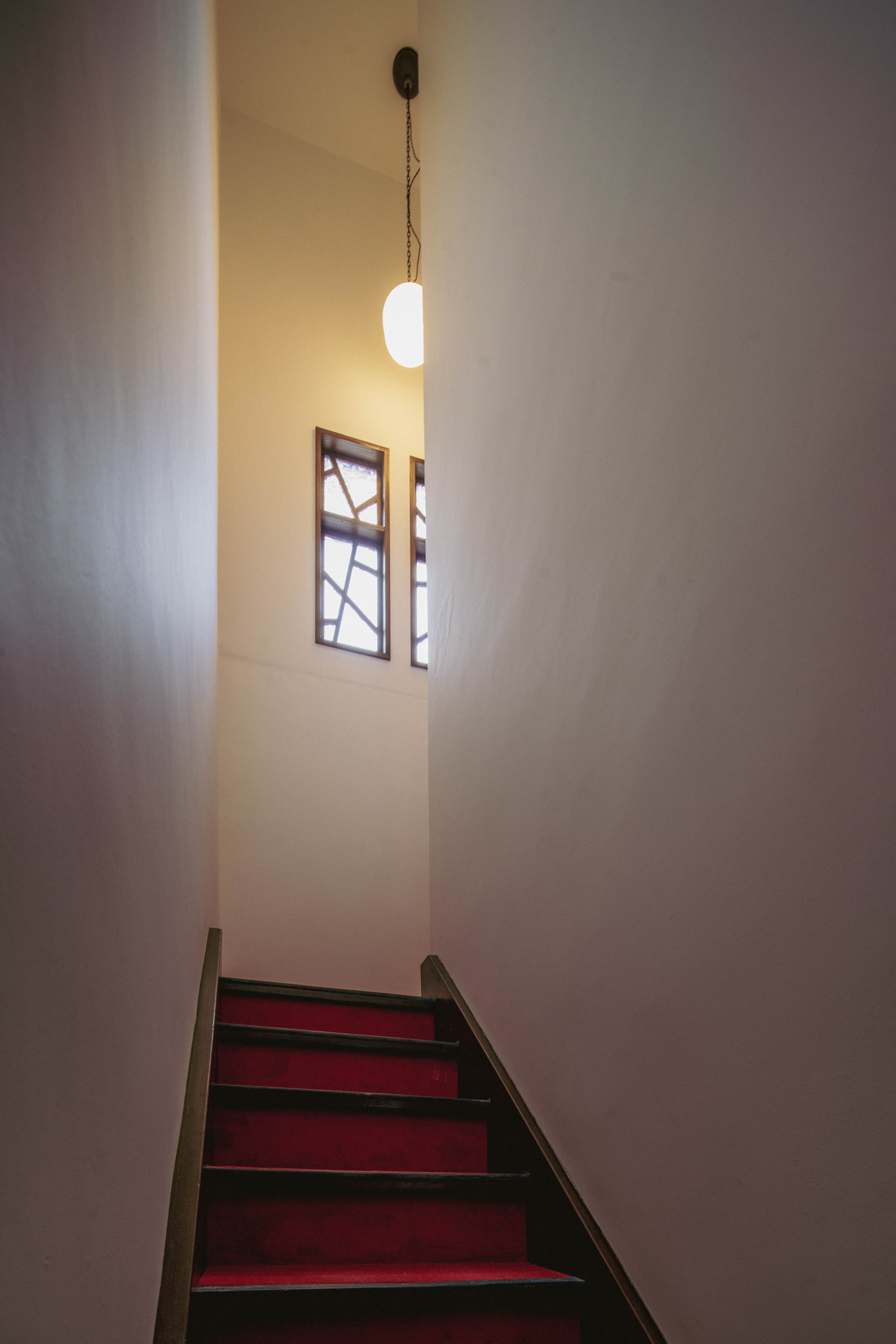 3階に向かう階段。天井が高く壁面は全て白の漆喰です。縦型の飾り窓は自家製、今後、お遊びでステンドグラスライクにするかもしれません。