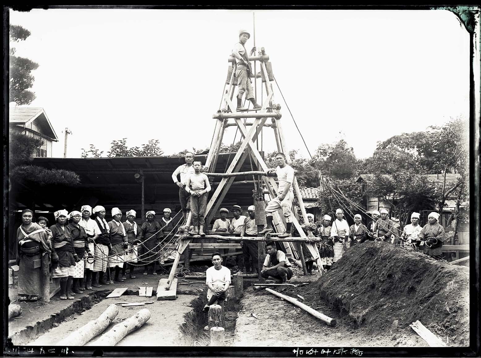 昭和10年の新発田大火で旧吉原写真館は全焼、翌年新吉原写真館が建築されました。この写真は、土台工事の写真の記念写真。撮影者は、施主である祖父・秀長でしょう。大工の棟梁の名は、木戸と記してあります。この時代、女性が引いて土台を作っていた。その時の歌、忘れました。左すみ、女の子をおぶっているのが、吉原イチ(曾祖父・吉原長平の妻)。