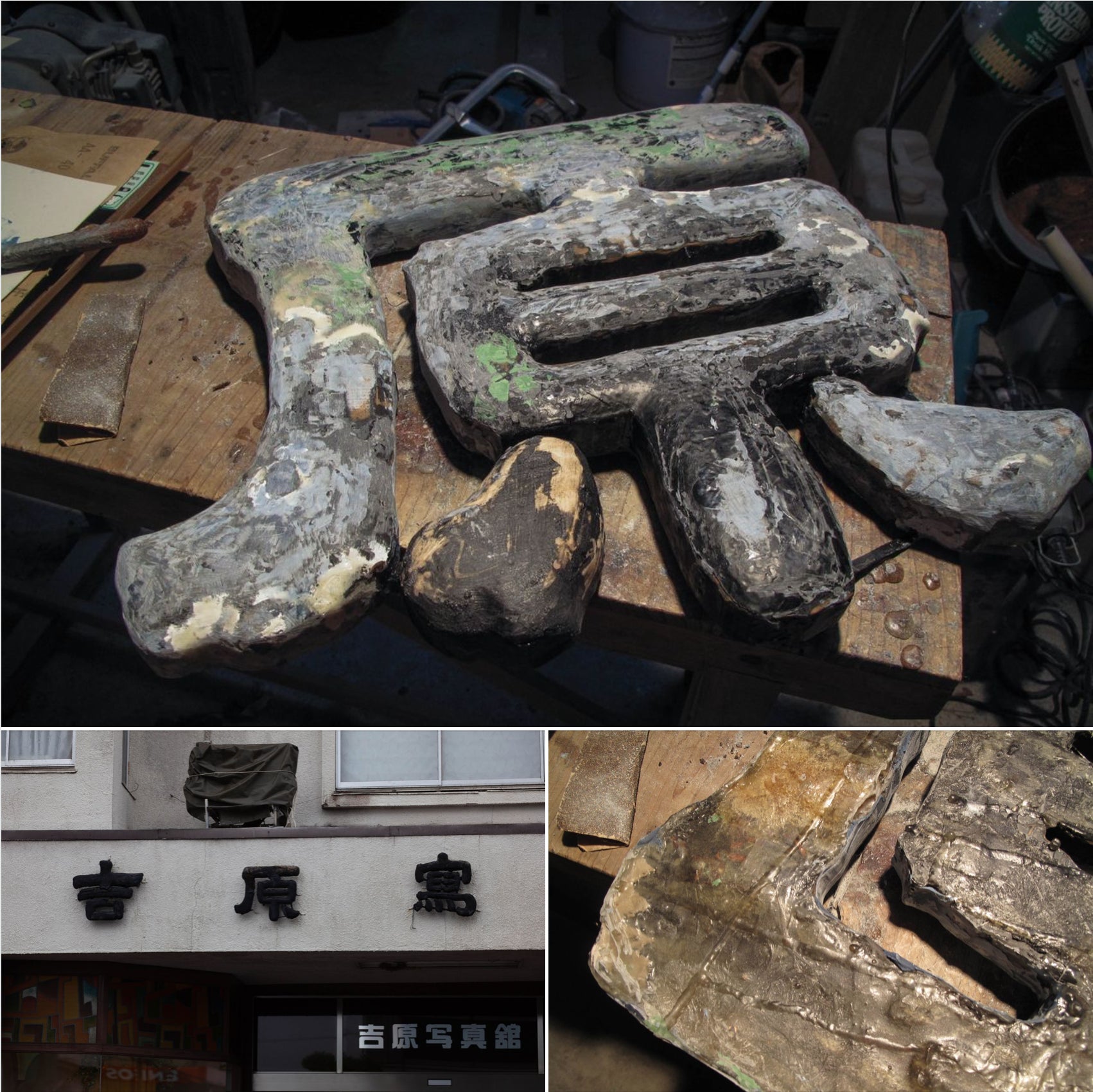2011年にも写真館の修復をしています。この時は、オリジナルの看板「吉原写真館」が、かなり傷んだいていので、陥没部には木をつめ、損失部分は復元、ガラスマットと樹脂でコーティングしました。11年経過した現在、とりあえず問題ないようです。
