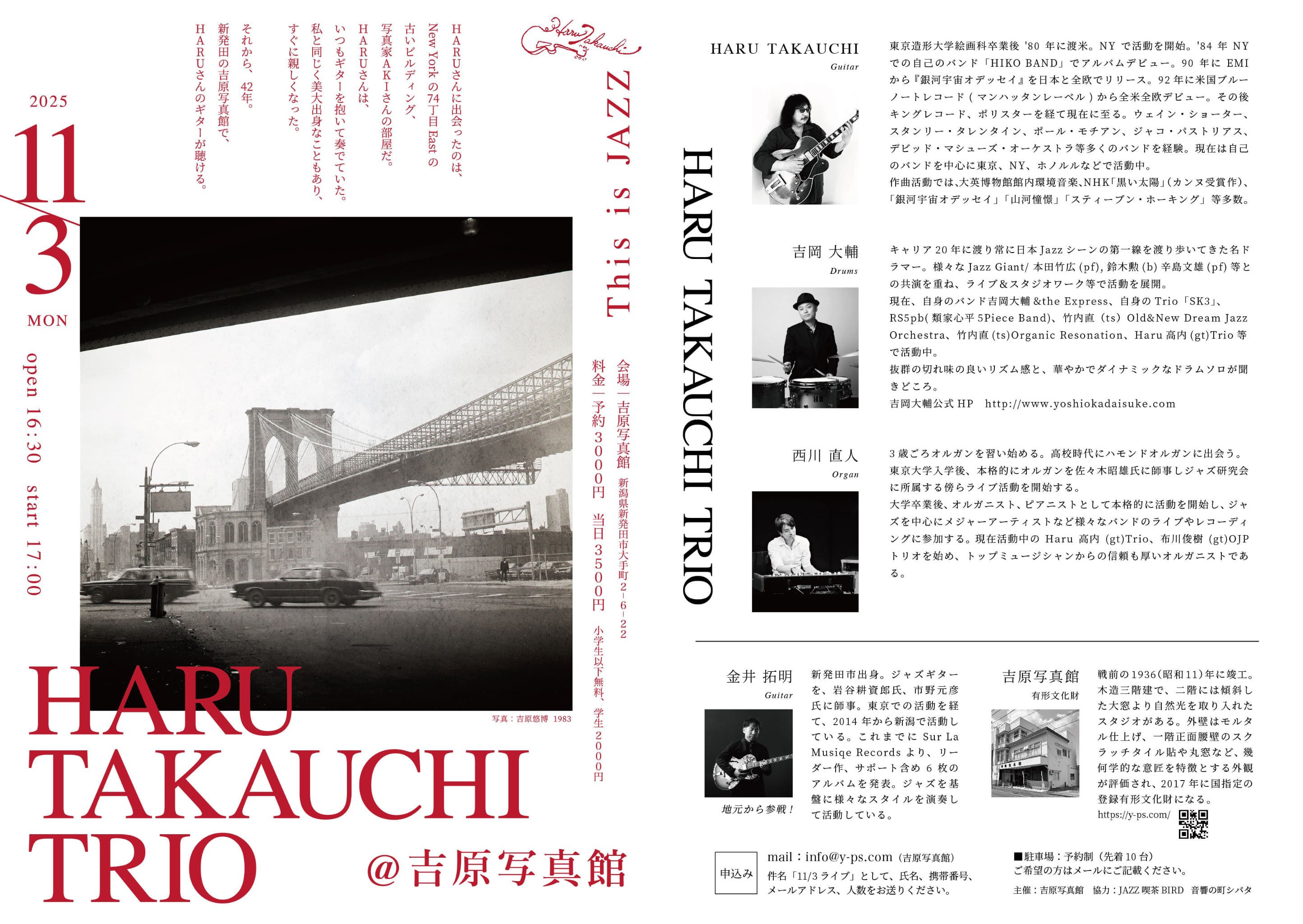 写真館でのジャズコンサートのお知らせです。40名程度しかはいりませんので、お早めに!HARUさん、ウェイン・ショーター、ジャコ・パストリアスのバンドにも参加、大英博物館の館内環境音楽も作曲されてます!高内春彦さん、83年からの友人ですが、女優・松坂慶子さんの旦那様でもあります。
