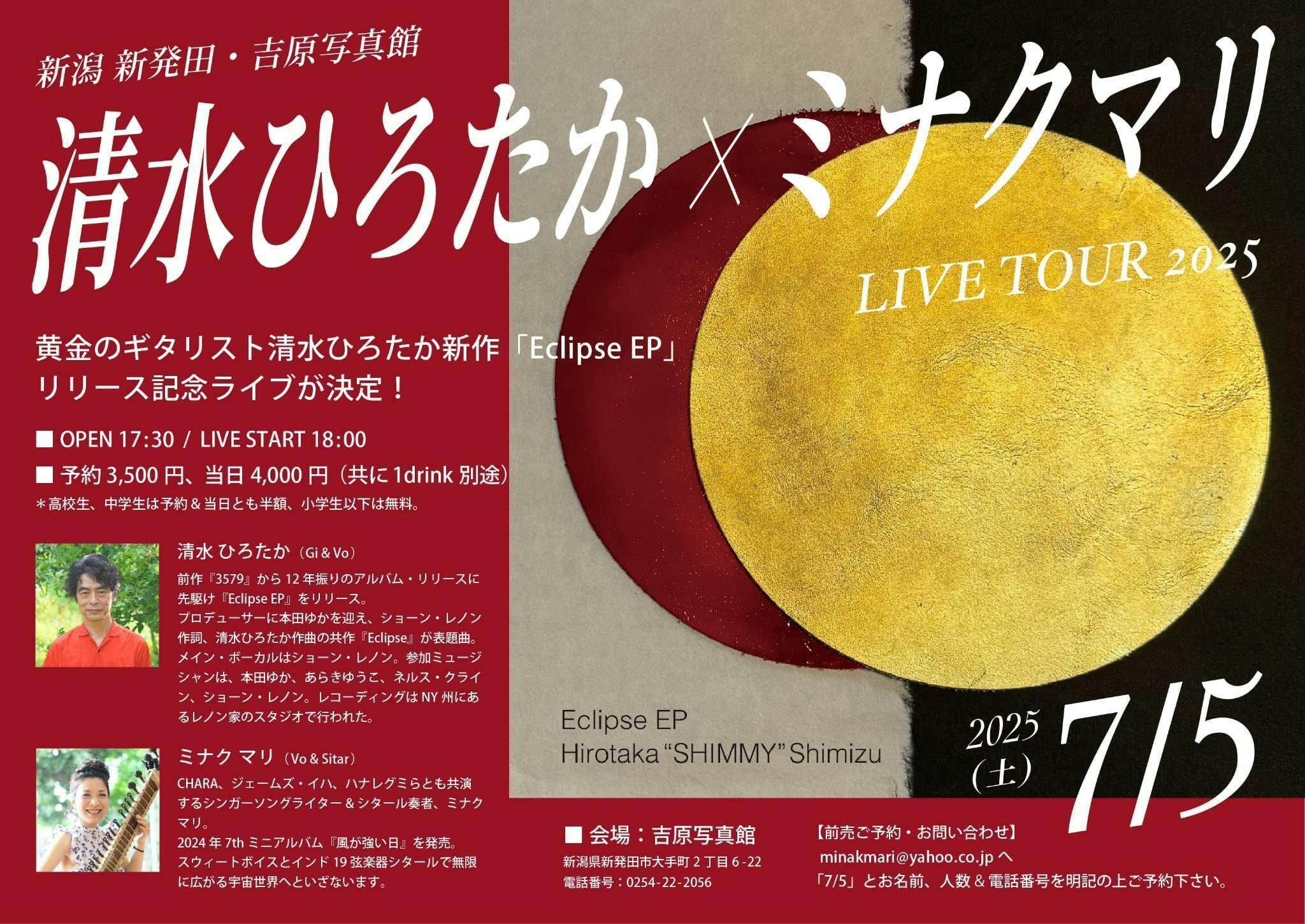 7/5(土)新潟 新発田・吉原写真館 清水ひろたか×ミナクマリ LIVE 2025。黄金のギターリスト・清水ひろたかの新作「Eclipse EP」のリリース記念ライブが決定!!!—————————————————————————————————————清水ひろたかさんは、オノ・ヨーコ、坂本龍一、細野晴臣、コーネリアス、デヴィッド・バーン、吉田建、ルー・ リード、ショーン・レノン、オーネット・コールマン、レディ・ガガ、など国内外のアーティストのレコーディング、ライブで共演のキャリアがある方、今回のアルバムもニューヨークのレノン家のスタジオで行われています。お話も楽しみです! —————————————————————————————————————出演: 清水ひろたか (Guitar&Vo)、ミナクマリ(Sitar & Vo)時間:OPEN 15:00 / LIVE START 15:30料金:予約 3500円、当日 4000円(共に+1drink別途)*18歳未満の高校生、中学生は予約 & 当日とも半額。小学生以下は無料(お子様は、保護者の方がみていただける方のみ可。) 会場: 吉原写真館新潟県新発田市大手町2丁目6-22電話番号:0254-22-2056https://y-ps.com/◎お申し込みは下記までminakmari@yahoo.co.jp1、氏名2、人数3、日程を記載してください。3日以内にご予約確認の返信メールをさせていただきます。携帯で受信される方は、PCメールが拒否設定されていないかご確認ください。レコード(CD)情報清水ひろたか 『Eclipse EP』前作『3579』から12年振りのアルバム・リリースに先駆け『Eclipse EP』をリリース。プロデューサーに本田ゆかを迎え、ショーン・レノン作詞、清水ひろたか作曲の共作『Eclipse』が表題曲。メイン・ボーカルはショーン・レノン。参加ミュージシャンは、本田ゆか(Key)、あらきゆうこ(Dr)、ネルス・クライン(Gt)、ショーン・レノン(Vo&Bass)、マイカ・ルブテ(B.Vo)、coba(Accordion)。レコーディングはNY州にあるレノン家のスタジオで行われた。ミナクマリ『風が強い日』共同プロデュースに清水ひろたかを迎えリリースされるミニアルバム『風が強い日』。レコーディングにはIsaGuitarra(ギター)、池田絢子(タブラ)、あらきゆうこ(ドラム)、清水ひろたかが参加するバンドThe Pirates A Go GoのメンバーによるPAGストリングスの島田光理・霜村真由美・田中詩織・大浦萌などステージでも共に演奏する機会が多い面々が参加。6曲中5曲はミナクマリの自宅で432Hzチューニングで録音された。---------------------------------------------------2025年に待望のNew Albumを発売予定。先駆けて2024年9月に先行Single『Eclipse EP』がリリースされる。表題曲の『Eclipse』は本田ゆかプロデュース、ショーン・レノン作詞、清水ひろたか作曲の共作。清水が1989年に録音したショーンの父、ジョン・レノンのカバー曲『Remember』も収録されている。