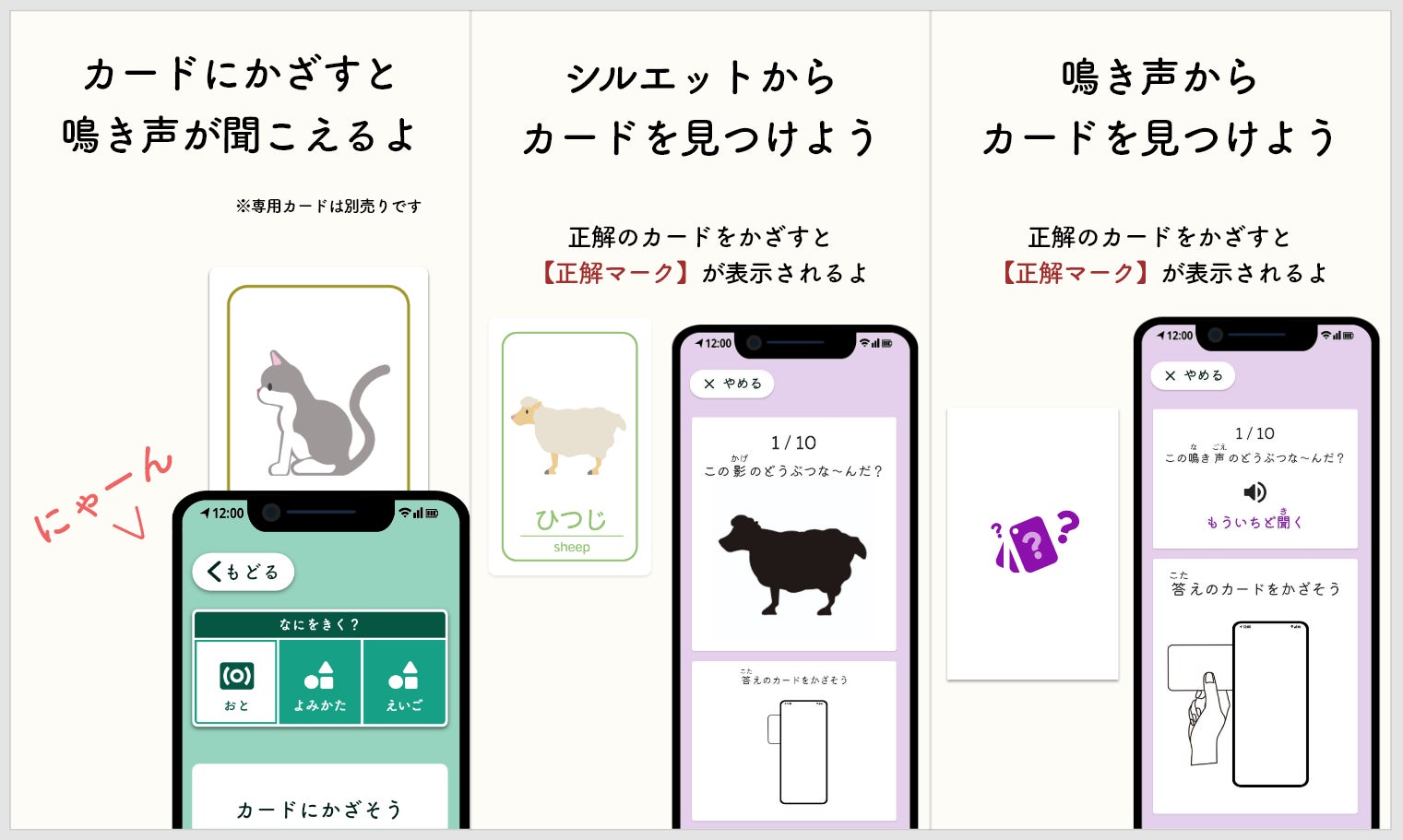 カードにスマートフォンをかざすと音が出る。直感的だけれども「面白い」動作によって、楽しくカードで遊ぶことができます。