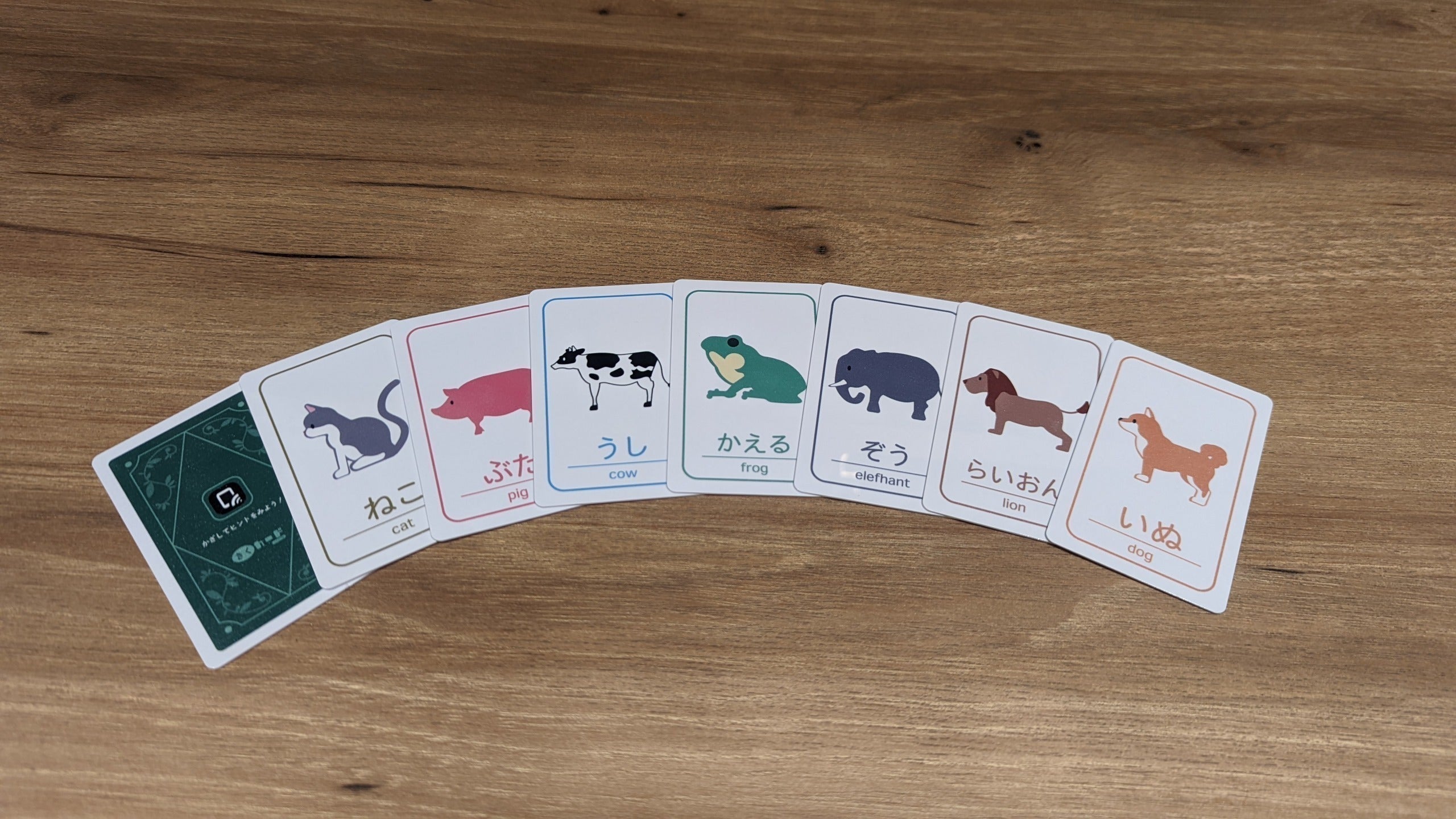 ★聞くカード(どうぶつ編)の表面にはどうぶつが描かれており、裏面はトランプのようなデザインになっています。★