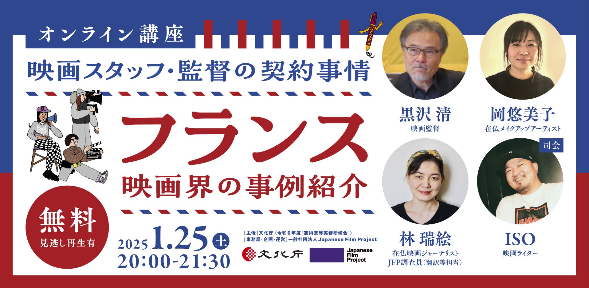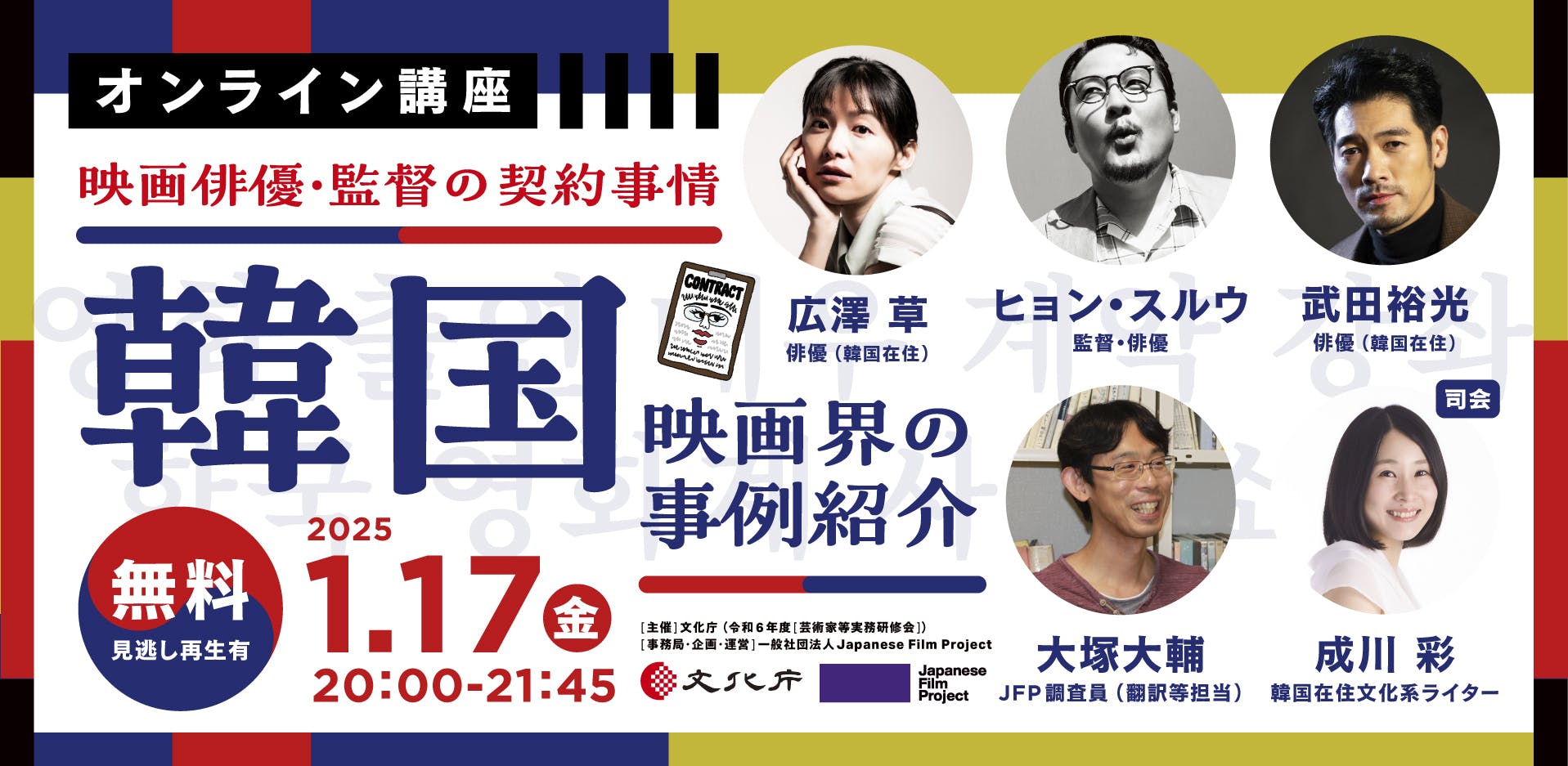 オンライン講座・契約研修会では、多様な映画人に登壇頂き、研修会は専門の弁護士によるレクチャー等もございます。参加無料・定員有りとなりますので、ぜひご活用いただけますと幸いです。