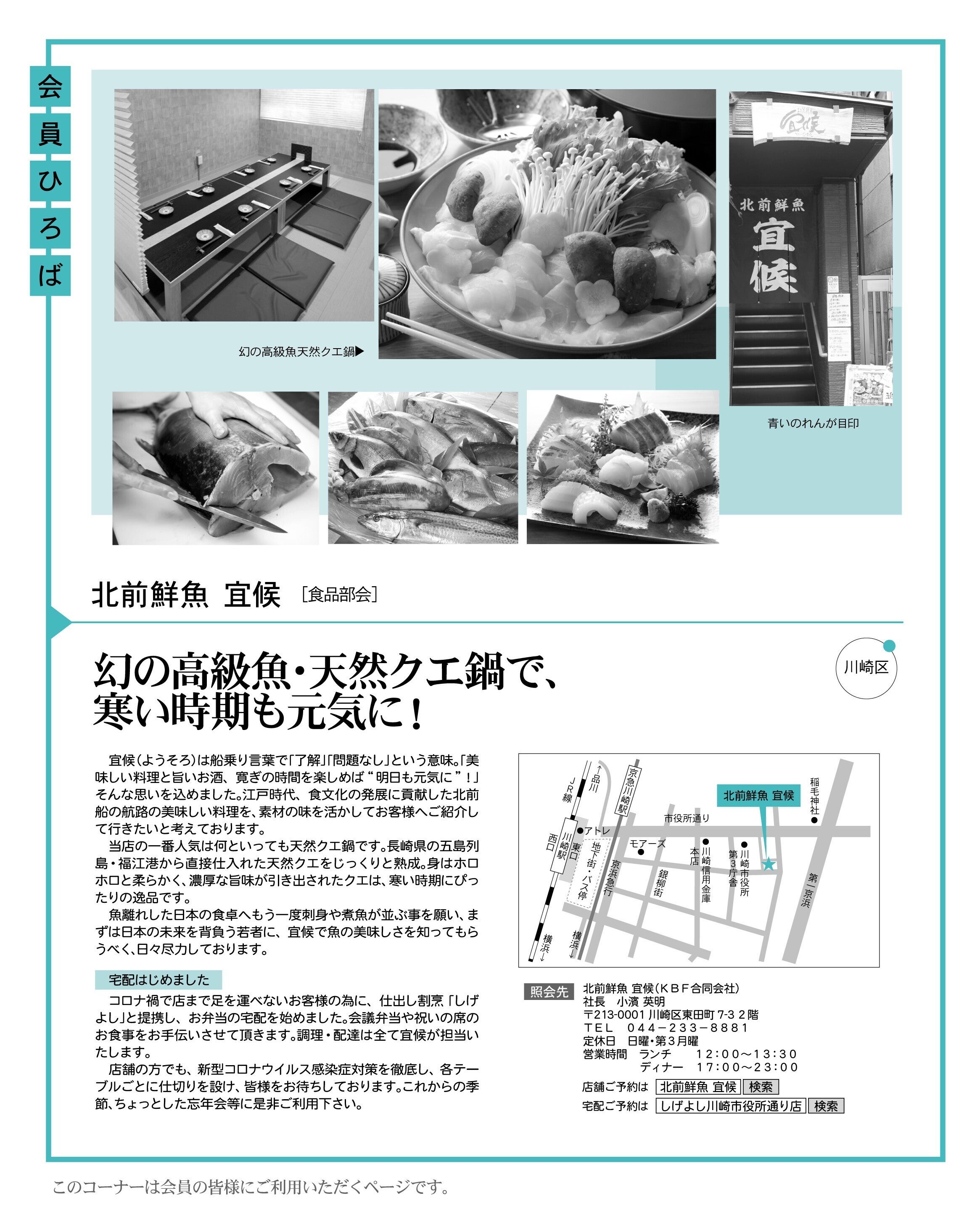 近頃、家庭の食卓から刺身や魚料理がどんどん減っている様に感じています。又、駅前の商店街にはチェーン店の居酒屋ばかり、こだわりを持って営業している店を探すのが、たいへんです。私たちの年代が若い方々にもっと魚の美味しさを伝えて行かなければ、日本の食文化が歪んでしまいそうで、2018年川崎の市役所の裏に「北前鮮魚 宜候」をオープンさせました。