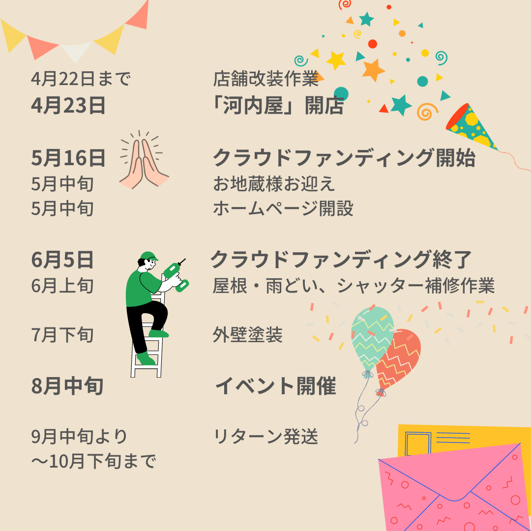 皆さまからご支援いただいた資金は、クラウドファンディングの手数料を差し引いた後、河内屋の改装費用に使わせていただきます。
