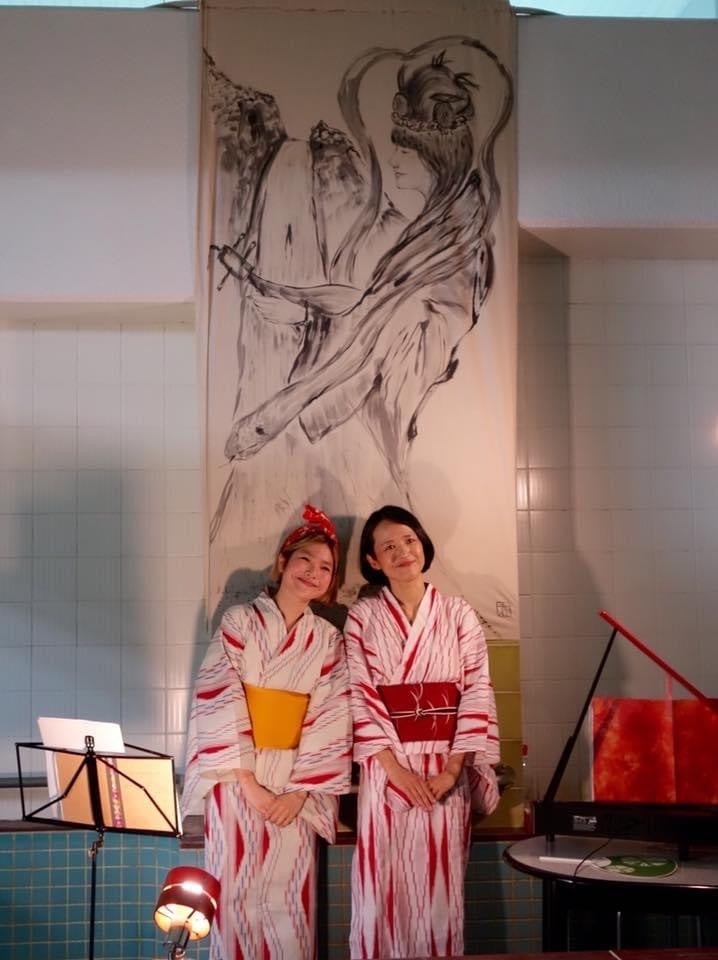 この写真はちょうど音楽活動を休止する前の2017年に、銭湯でライブをさせてもらった時のもの。(墨絵は動物墨絵師佐藤周作さんがわたしのアーティスト写真をもとに描かれたもの・写真はお客様の小宮さん撮影)(おそろいの浴衣でお風呂の中で歌ったのは気持ちよかったな~)