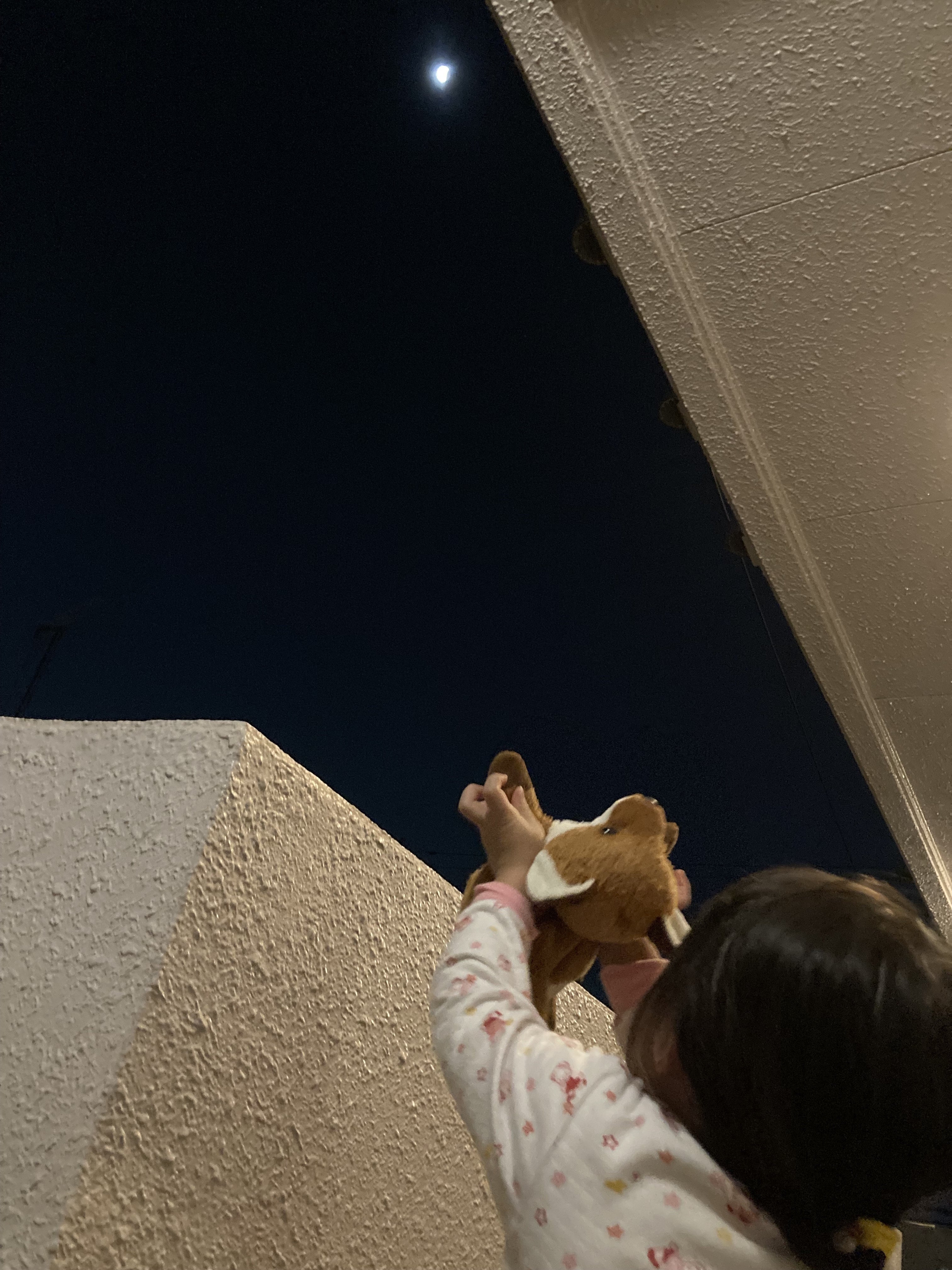 眠る頃にはきっといつものお月様に戻っているよ、と話していたので最後にもう一回見にいこう!と誘ってくれた娘が、キツネのキッキにも月を見せていてとても愛おしく思いました。