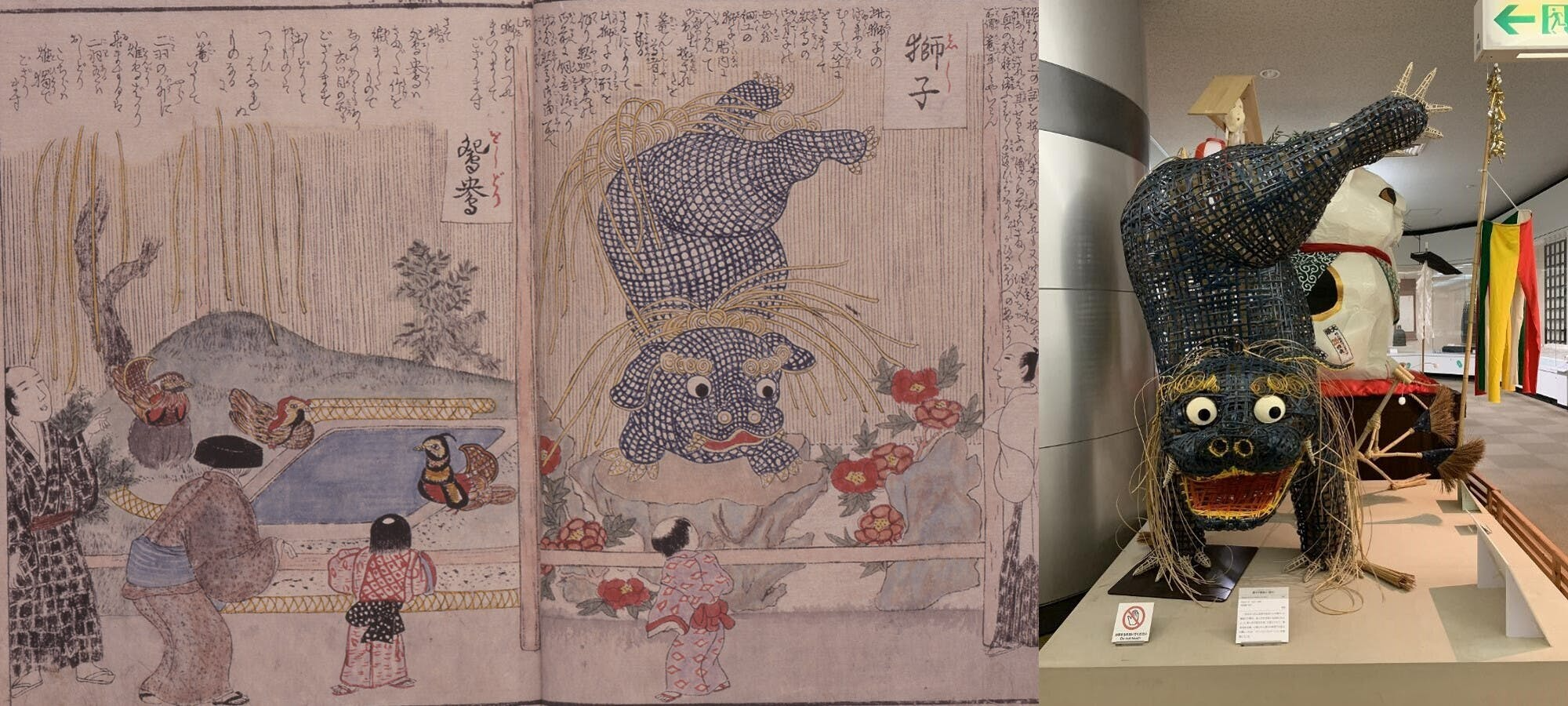 猿猴庵が描いた籠細工の見世物(名古屋市博物館所蔵)と再現された獅子(名古屋市博物館に展示されている)