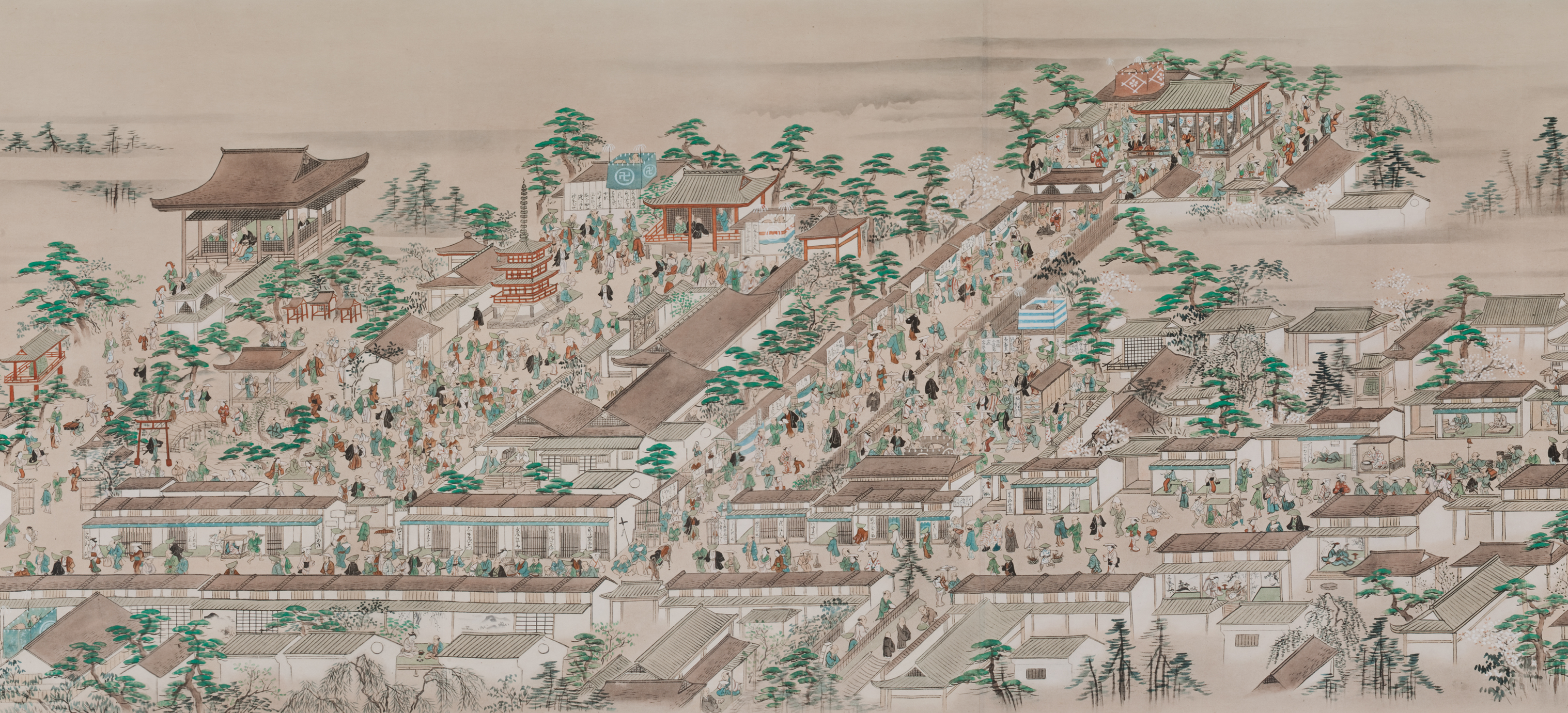 縦56.5cm×横372cmの「享元絵巻」は、七代尾張藩主宗春治世下の名古屋の賑いを描いた大変貴重な絵です。大須観音や七つ寺の境内に見世物小屋や芝居小屋が並び大勢の人が繰り出しています。