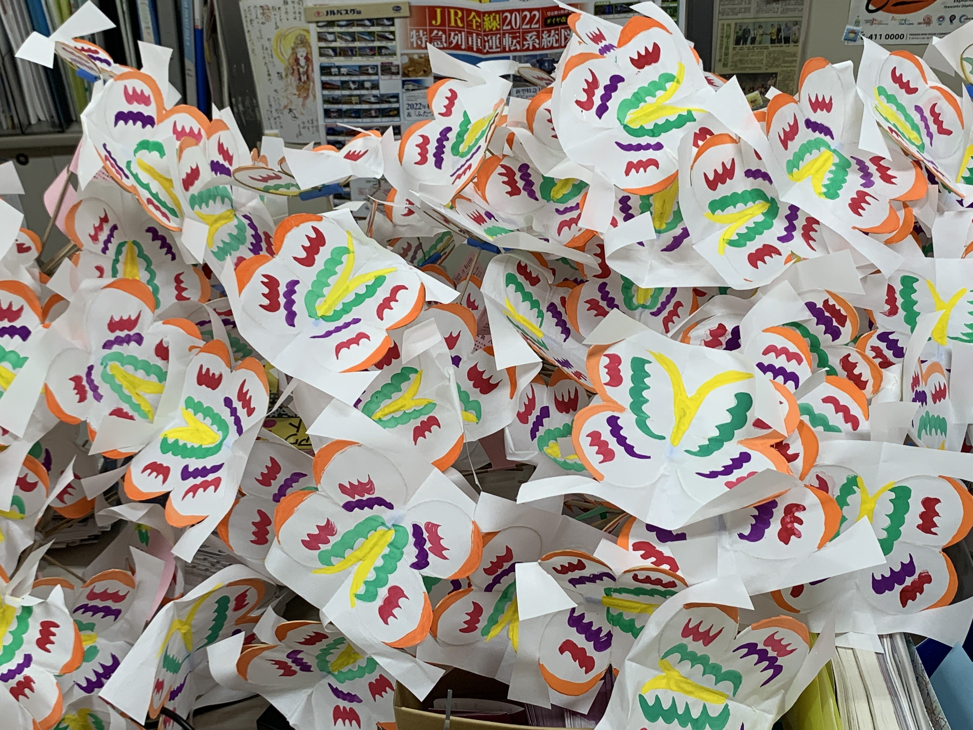 仕事帰りに、八事の蝶々保存会の安江さん宅を訪問し、蝶々をいただいてきました。数えたら200本以上もあるではありませんか!八事の蝶々はステージで小道具として使わせていただきますが、観客の皆さんにも公演の演出に一役買っていただきます。八事の蝶々に囲まれてハッピー!