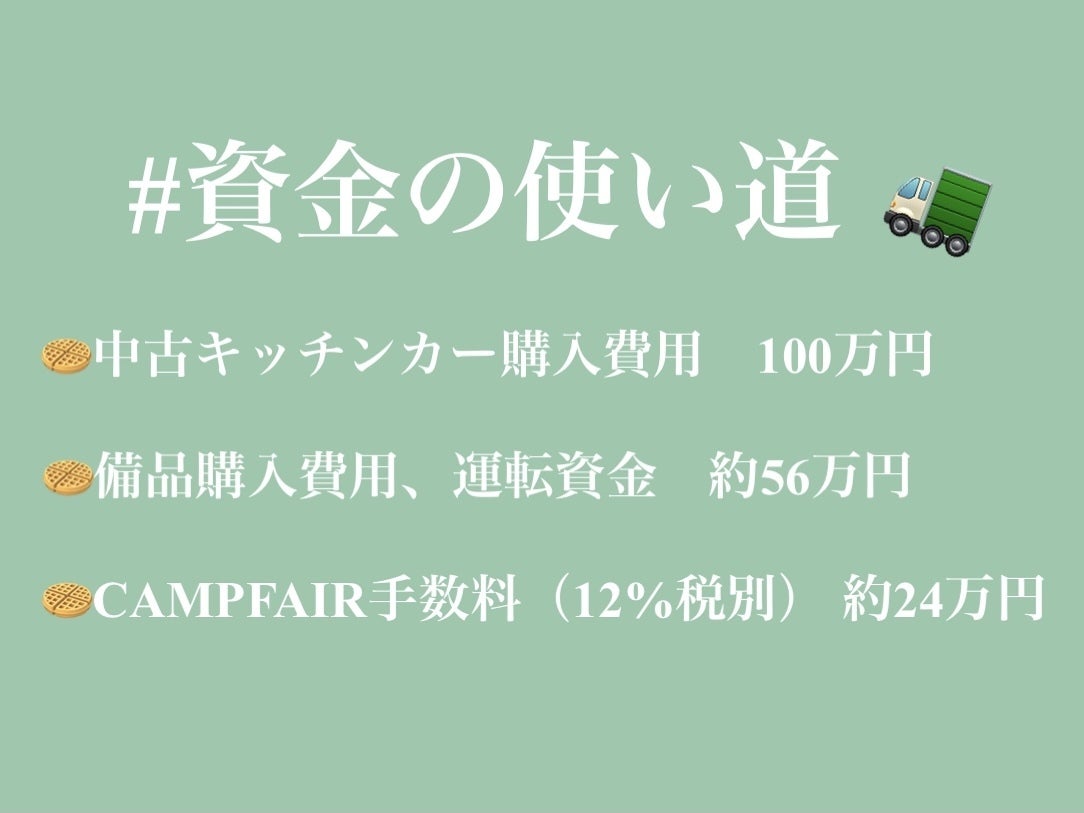 皆様からいただいた応援の支援金に関しては、キッチンカー購入の資金とさせていただきます。