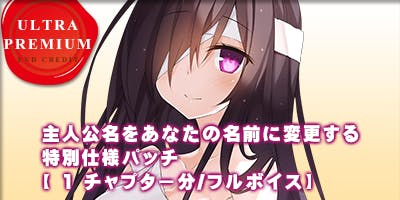 ゲーム本編のうちお好きな1ヒロインのシナリオを「あなたのお名前に変更」する特別パッチを制作いたします。フルボイスで制作しますので、該当チャプターのメインヒロインと登場人物たちが実際にあなたのお名前を呼びながらシナリオが進行します。没入感を味わうことのできる仕様です。
