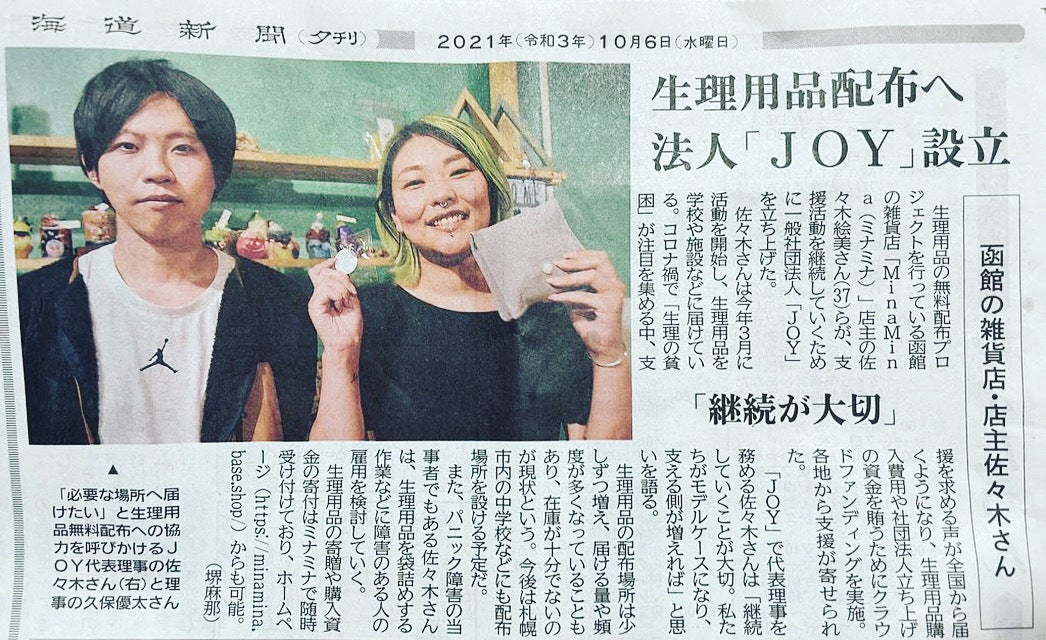 北海道函館市の一般社団法人JOY( ホームページ )代表理事で【生理用品無料配布プロジェクト】の発起人、生理用品マイスターという肩書きで TikTok や Twitter などで生理と生理用品についての情報発信中の佐々木絵美と申します。