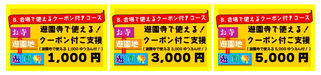 100,000円・・・会場内掲示板の「上段先頭」に「一番大きな文字で」お名前が載ります。また、エア遊具の前に独立した「〇〇〇社様提供」の立札を掲示します。