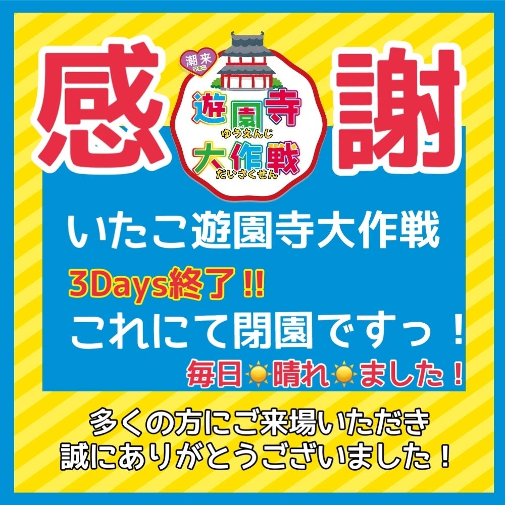 2022/05/05 23:58【遊園寺全日程終了しました】2022年5月5日、3日間にわたる「潮来遊園寺大作戦」が無事に終了いたしました。おかげさまで連日たくさんの方にご来場いただきましたが、大きな事故もなく笑顔で楽しんでいただくことが出来ました。この開催にあたっては我々青年会議所の会員のみならず、協力団体様の力添えなくては決して開催することは叶いませんでした。ここに心からの感謝を申し上げ、ご挨拶に代えさせていただきます。ありがとうございました。一般社団法人潮来青年会議所 もっと見る
