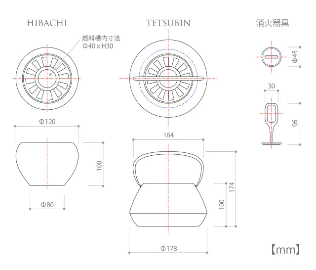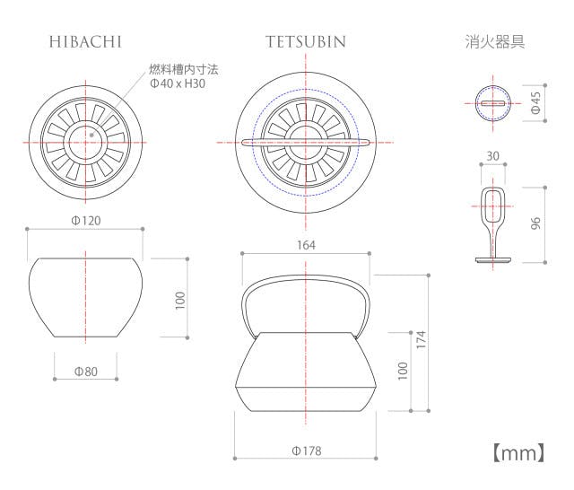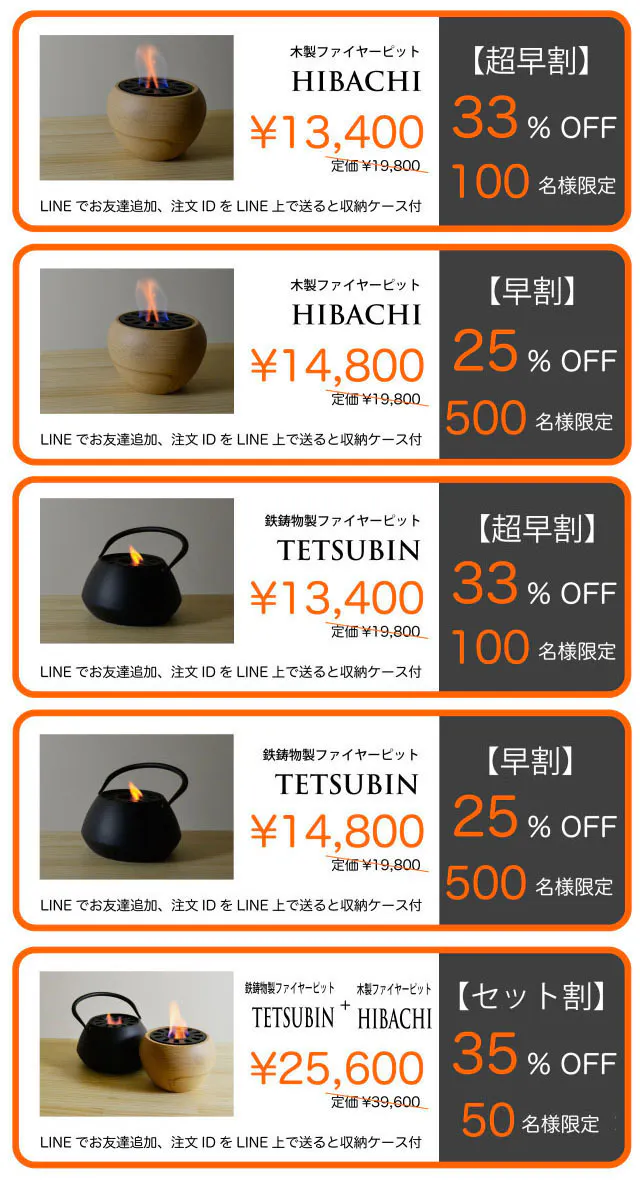 【TOMOSHIBI】には、『HIBACHI』と『TETSUBIN』という選べるふたつのデザインをご用意しました。それぞれ「火」にまつわるストーリー性を持たせたデザインです。