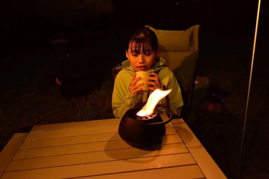 【TOMOSHIBI】は、煙や煤や燃えカスなどが出ないため煙突が不要で、マンションやアパートなどの屋内空間でも使用することができます。もちろんテント内でも使用可能です。