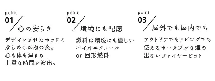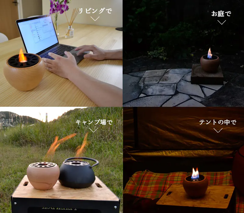 火は人の心を解きほぐし毎日の生活や仕事でぎすぎすした気持ちを溶かしてくれます。現代社会は多忙な日常です。時間に追われ日々余裕がなくなってしまいがちな毎日に少しの癒しを。