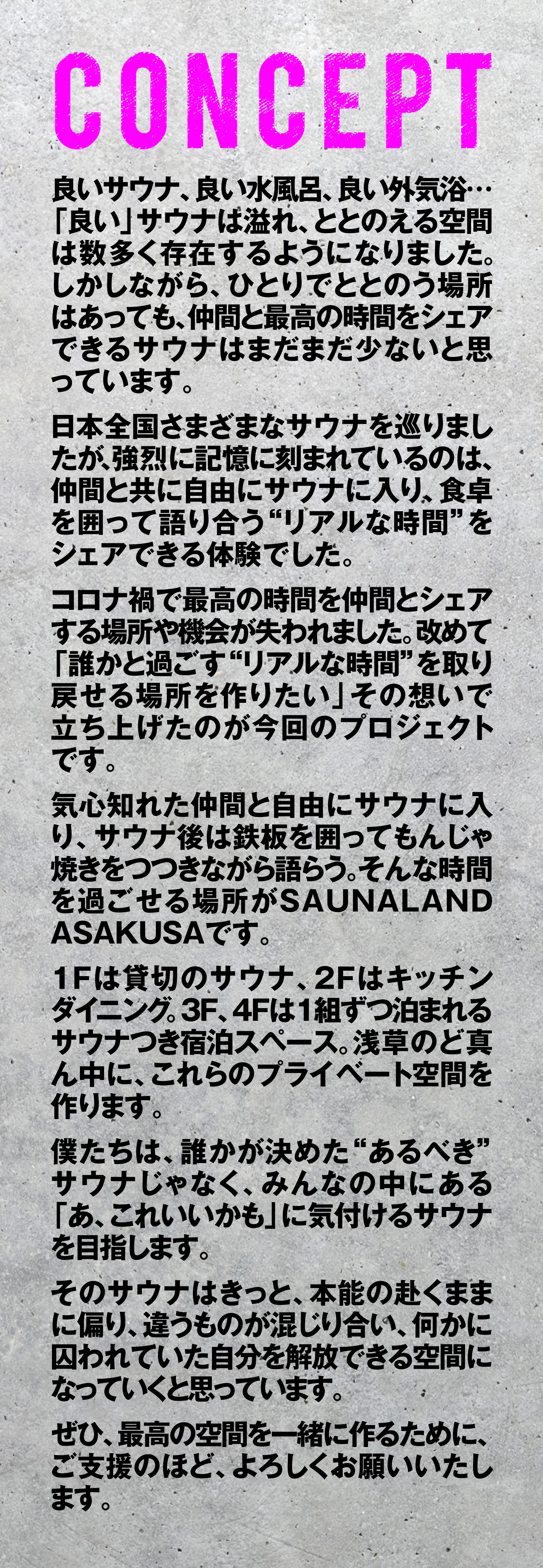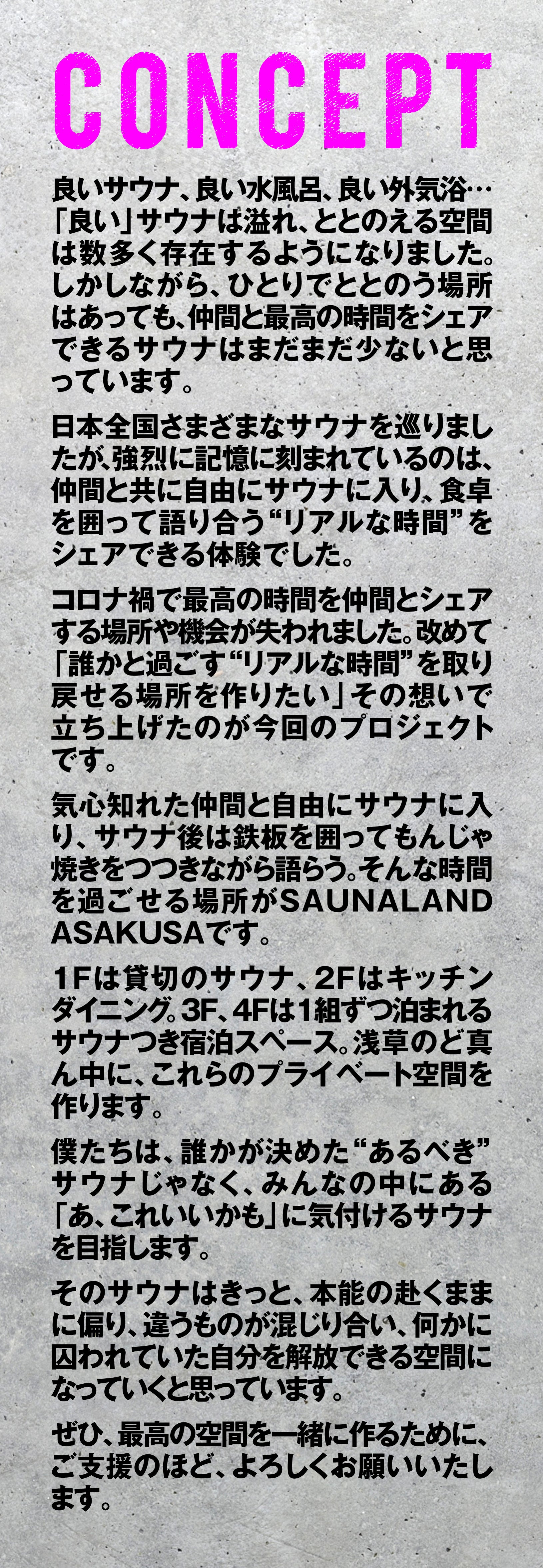 コロナ禍で過ごした2年の間、失われた“仲間と共に自由に過ごせる時間”を取り戻せるサウナを、この場浅草に作ることが、今回のプロジェクトの目的です。