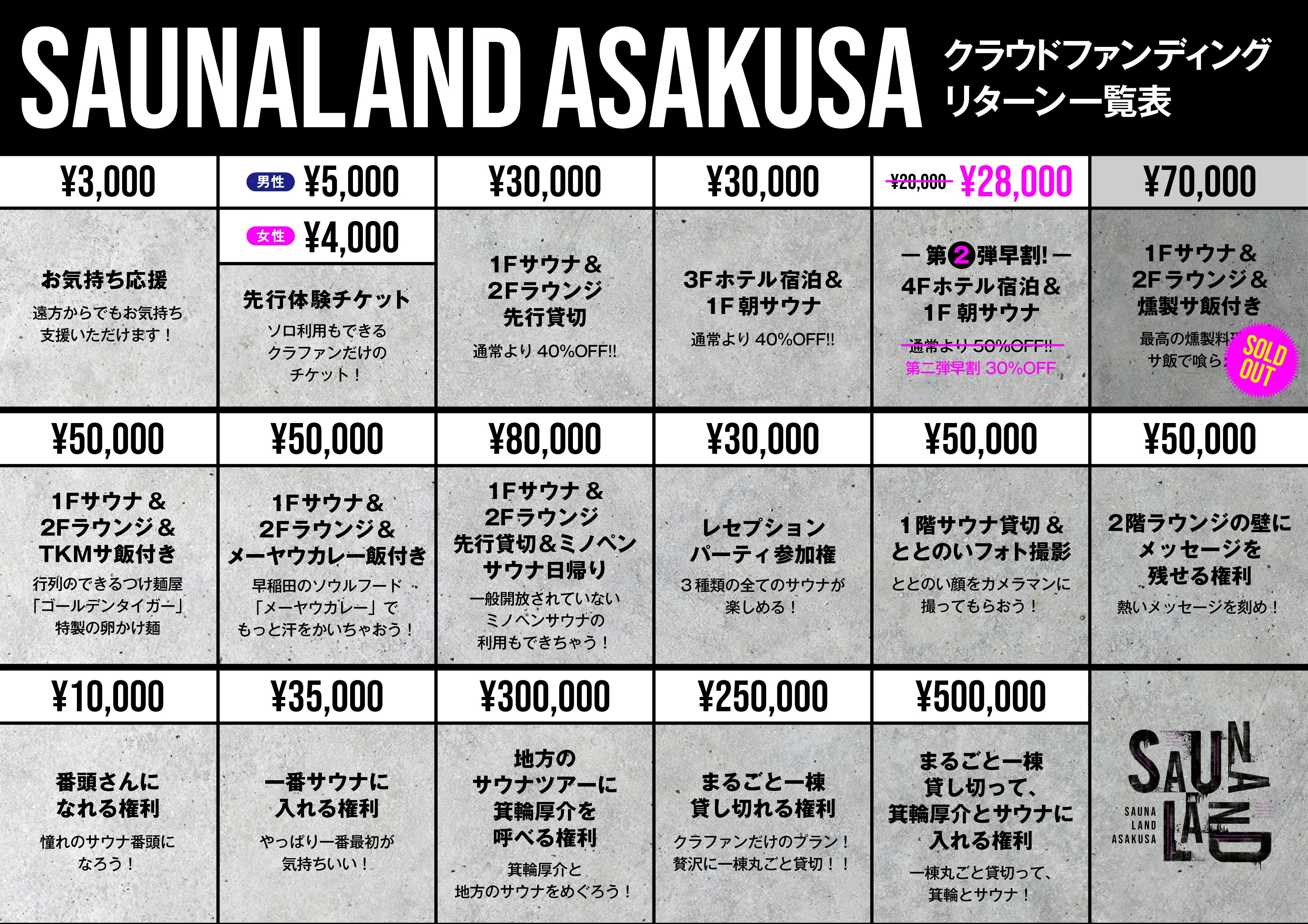 今回追加したリターンは、いずれも原定数のあるものです。ぜひ、お見逃しなく!引き続きSAUNALAND ASAKUSAをよろしくお願いいたします!!