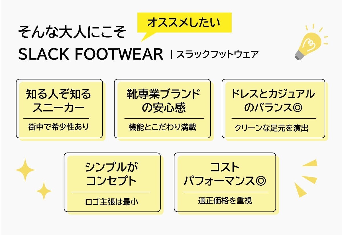 そんな方はSLACK FOOTWEARを選択肢に!ありそうであまり無い「シンプル」がコンセプトのスニーカーブランドです。ベーシックな見た目にこだわりを詰め込み、履き心地も妥協しない一足が見つかります。