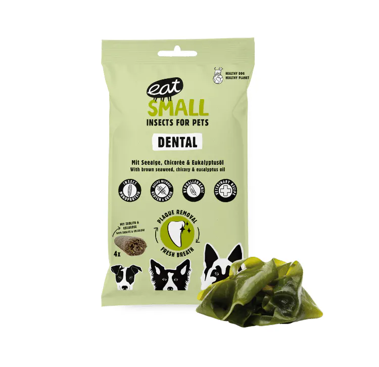 昆虫タンパク質スティック。嚙むことによって口の衛生状態が良くなり、歯垢・歯石を積極的に予防、口臭改善が期待されると言われているアスコフィルムノドスム(Ascophyllum Nodosum)という海藻が含まれています。
