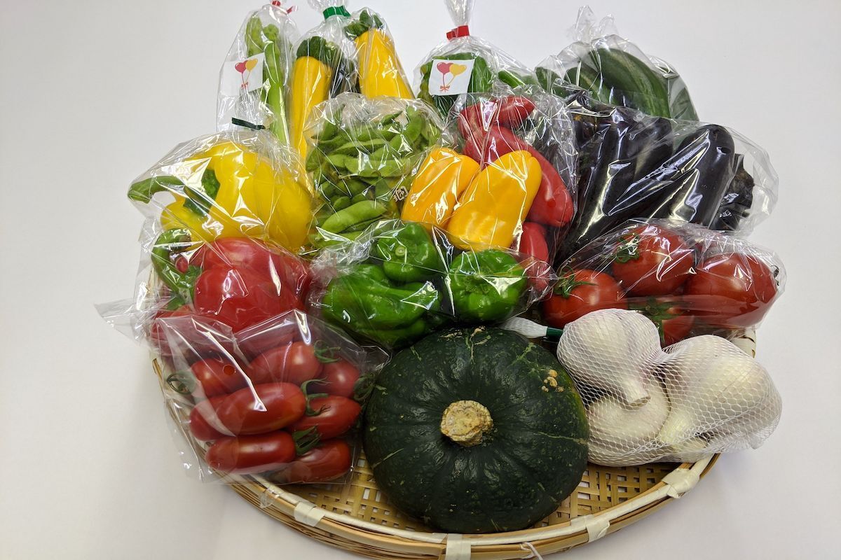 遊佐町産の農作物を10点前後詰め込んだ野菜BOX