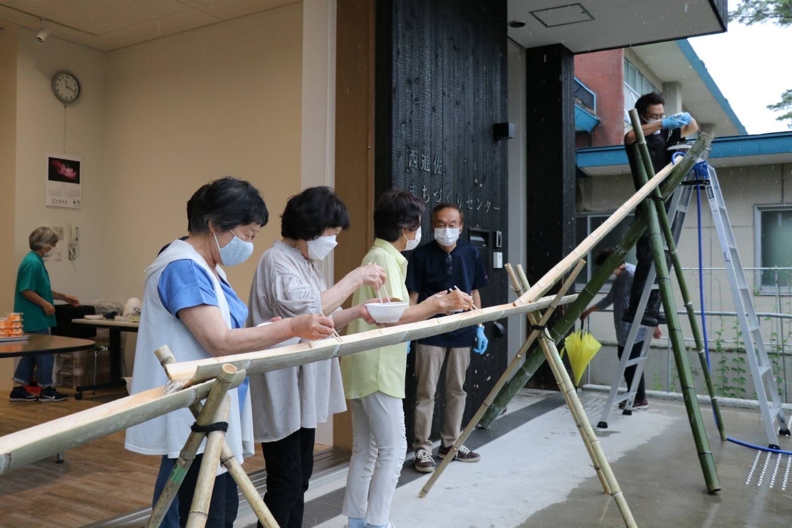 2022/07/19 16:00いつもご支援・ご鞭撻のほどありがとうございます。遊佐町地域おこし協力隊の中島です。今回はタイトルの通り「竹を通じて地域との交流機会をつくりたい!」プロジェクトの続きです。実は竹林整備で間引いた竹で、、、流しそうめんのレールを作っていました。晴れた場合は↑写真の様に竹レールを設置する予定でしたが、当日はあいにくの雨。雨に配慮しながら、そうめんを流します。意外にも流しそうめん経験者が少なく、地域の方々に喜んでいただけたので良かったです。ご協力いただきました皆様、ありがとうございました。補足:メンマは順調に発酵しており、現在パッケージデザインを決めている段階です。引き続きよろしくお願いいたします。 もっと見る