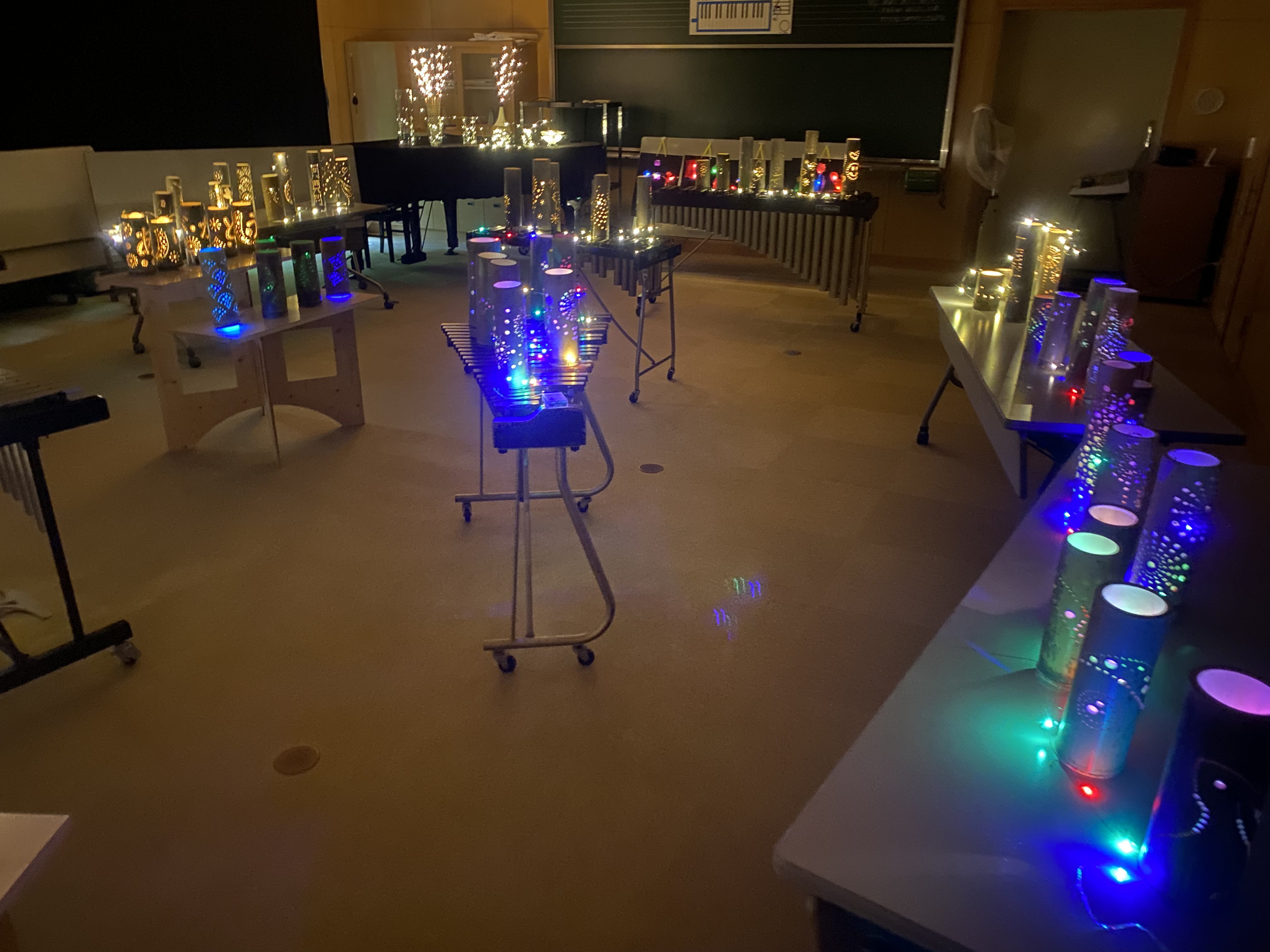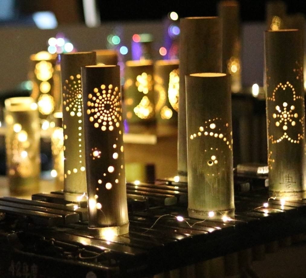 机やピアノ台、鉄筋や木琴などの上に竹あかりを設置しました。