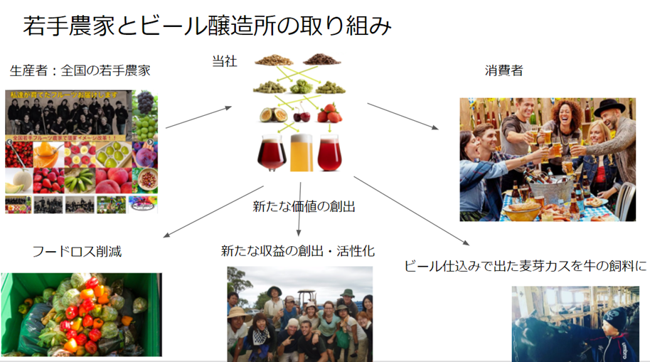 アメリカのスーパーでは、少々形が悪い果物でも普通に販売されており消費者も特に気にすることなく購入しておりますが、日本のスーパーでは厳しく選別されるので店頭で陳列される事はありません。その結果、形、色が悪いというだけで毎日多くの食物が廃棄されています。そのような商品をビールに利用することによって農家にとっての新たな収益機会の創出に繋げたいと考えております。また、私自ら全国の若手生産者のもとに尋ね果物の特徴、生産者の想いを聞きレシピ開発を行い、仕入れから発売までの流れを当社のSNS(インスタやYOUTUBE)で配信することで生産者の紹介やイメージアップに貢献していきます。私の活動を通じて、農家さんの新たな収益の創出とフードロスにも繋がるこの活動が他の醸造所に浸透すれば、町の活性化や新たな雇用の創出にも繋がっていくのではないかと考えます。また、生産者をより近くで感じて安心して食べられる、飲めるような取り組みにしたいと考えております。