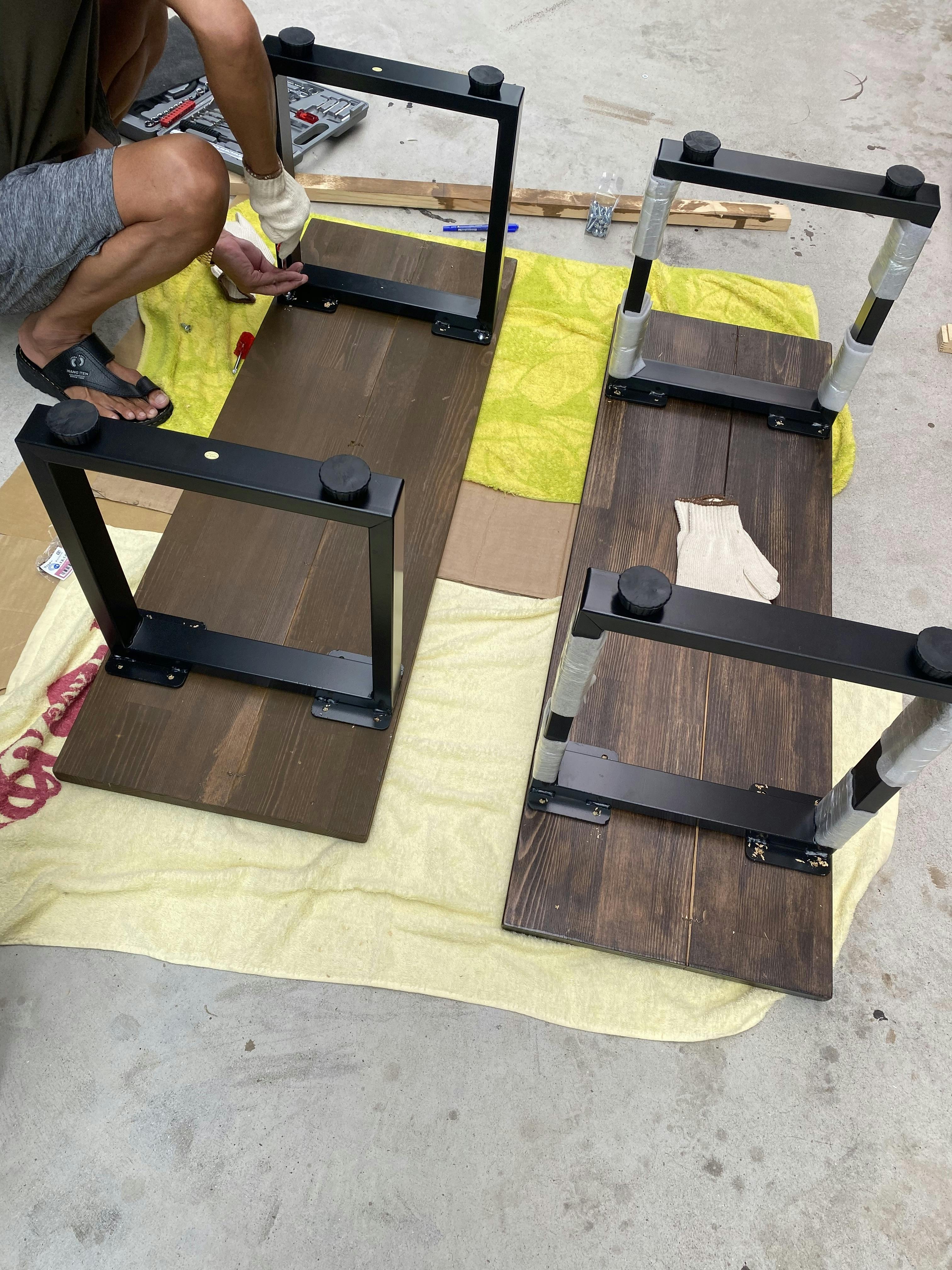 店舗で使用する机、椅子の最終仕上げに入りました!親父ががっつり作業してくれて助かってます。