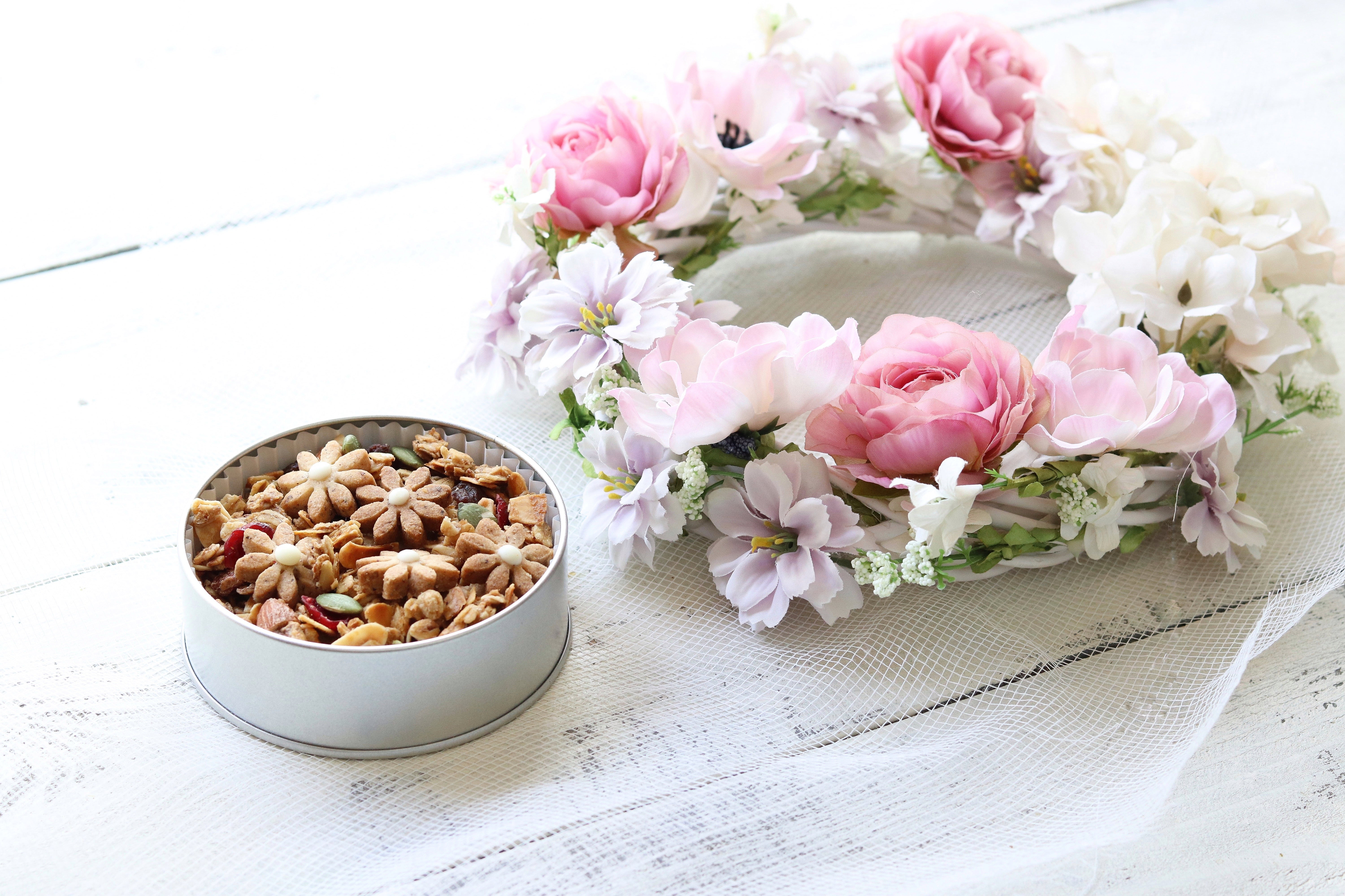 食物繊維豊富な有機オートミールをたっぷり。米粉であえて少しかたまりを作り、口に入れるとハラっと崩れる絶妙なザクザク食感に焼き上げました。今回だけの特別仕様でリッチな香ばしさがたまらないヘーゼルナッツのお花のクッキーを乗せました。コラボオリジナル商品です。(賞味期限 未開封で20日)