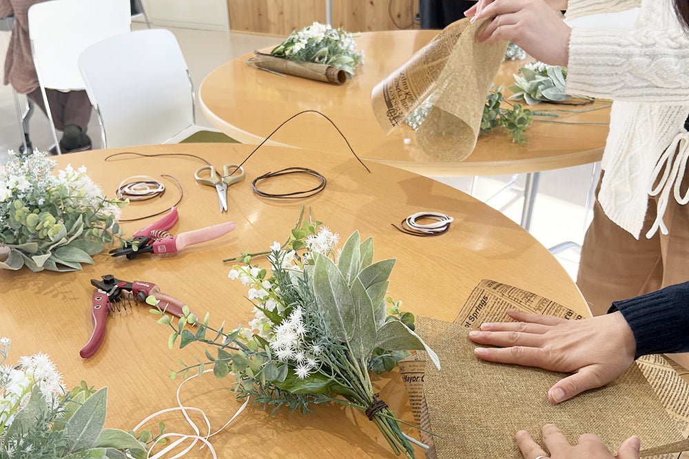 私の経験がお役に立ち、少しの光になれたのかなと思うと本当にうれしく思います。手を動かしながら人と接することで気軽に打ち解け、色々なお話を聞かせていただけることが出来ます。また、作品を完成することで達成感や充実感を味わっていただき、お花に触れることで自己肯定感が生まれます。些細なきっかけで変われます。