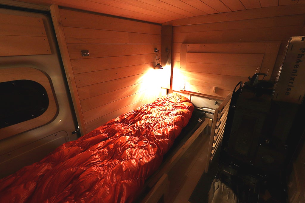 ↑サウナベンチにサーマレストとエアウィーヴを敷いて、寝袋に包まれて眠る…