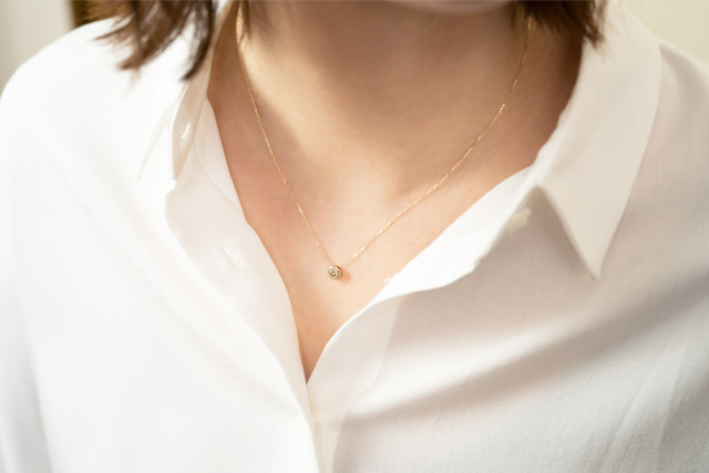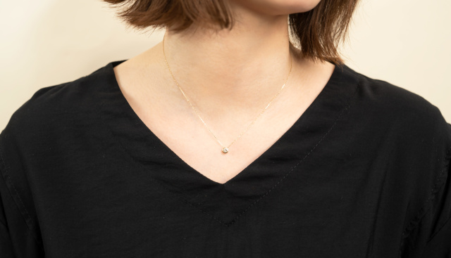 またシンプルな一粒ダイヤだからこそ、お手持ちのネックレスと重ね付けしてアレンジを楽しむことができます。