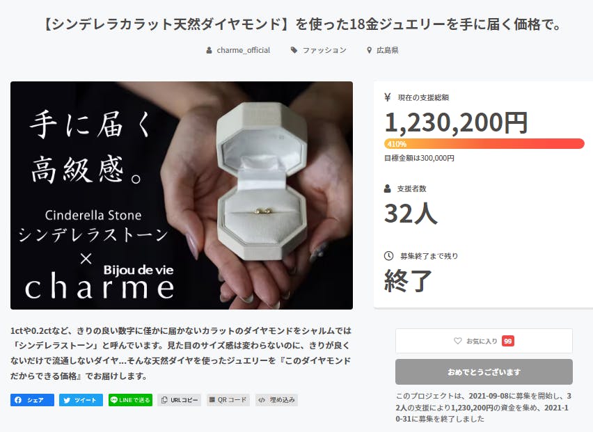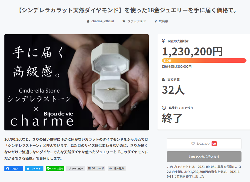 私たちは【シャルムジュエリー】を制作するために、工場とデザイン・仕様を実現できるよう、プロジェクトを誠心誠意進めています。 しかしながら開発中の工程において、デザイン・使用が一部変更になる可能性もございます。製造スケジュールについては、プロジェクト成功を想定した数で調整しておりますが、想定を上回る応援の申し込みがあった場合、製造や発送に伴うやむを得ない事情によりお届けが遅れる場合がございます。上記のようにプロジェクトページに記載している内容に変更がある場合は、活動レポートなどで共有を行っていく予定です。 本文中に記載させていただいたスケジュールは、あくまでプロジェクト公開時点の予定です。応援購入の性質上、配送遅延のおそれがございます。 原則として、配送遅延に伴う応援購入のキャンセルはできませんが、リターン配送予定月から3ヵ月を超えた場合には、希望者に限りキャンセルにて対応させていただきます。