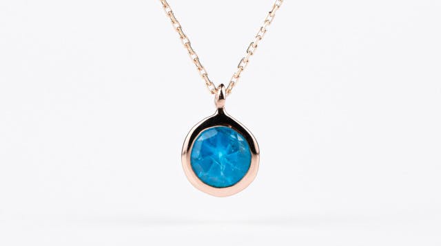このプロジェクトでジュエリーに仕立てたのは「ネオンブルーアパタイト」。