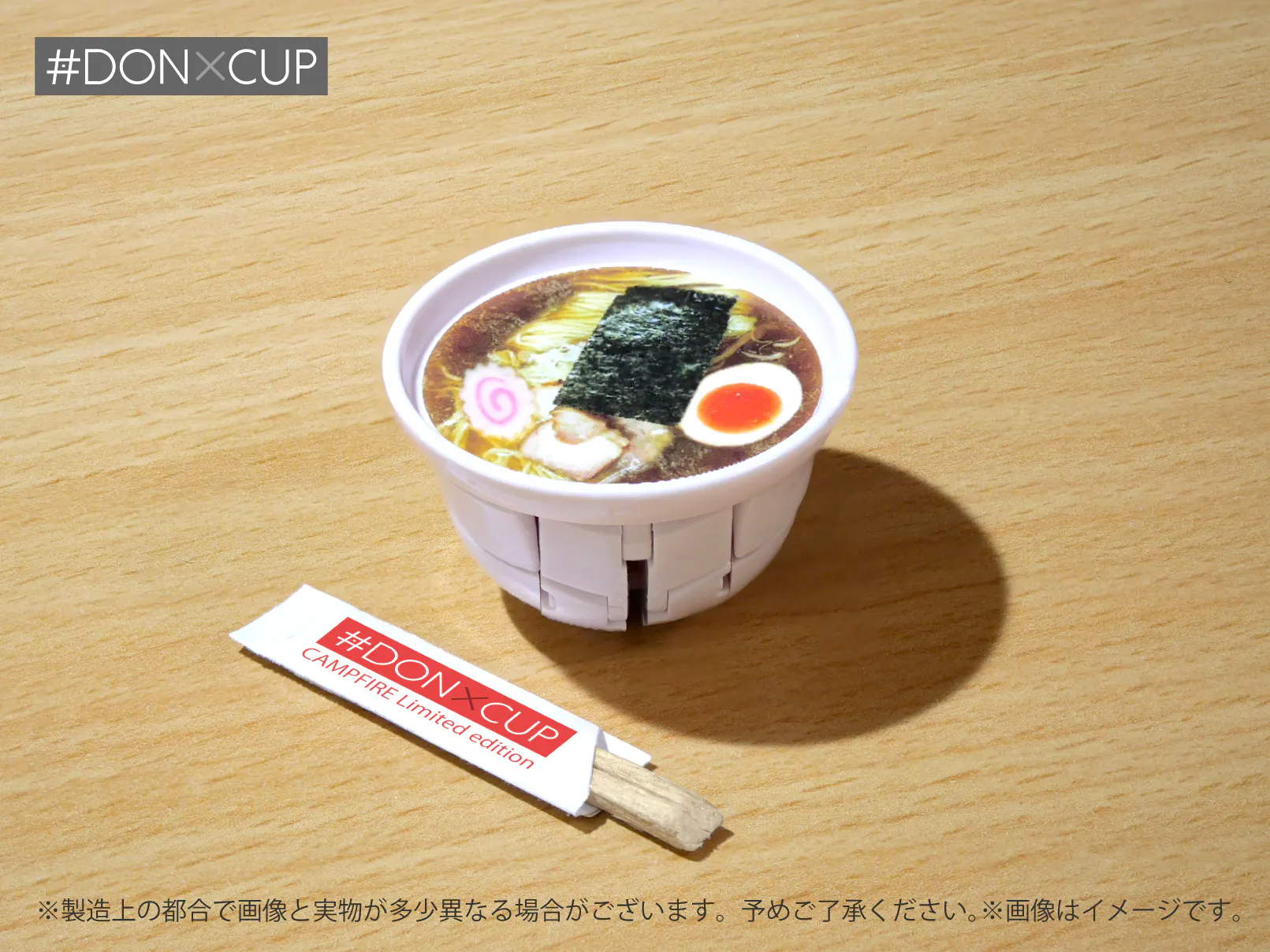 「#DONXCUP」はどんぶり形状から約59mmの大きさの人型形状に変形するマスコットフィギュアです。国内で製造し、再生素材プラスチック樹脂を使用したSDGsな製造品です。本プロジェクトでは支援者様へのリターンとして製造品「#DONXCUP」をお贈りさせて頂きます。