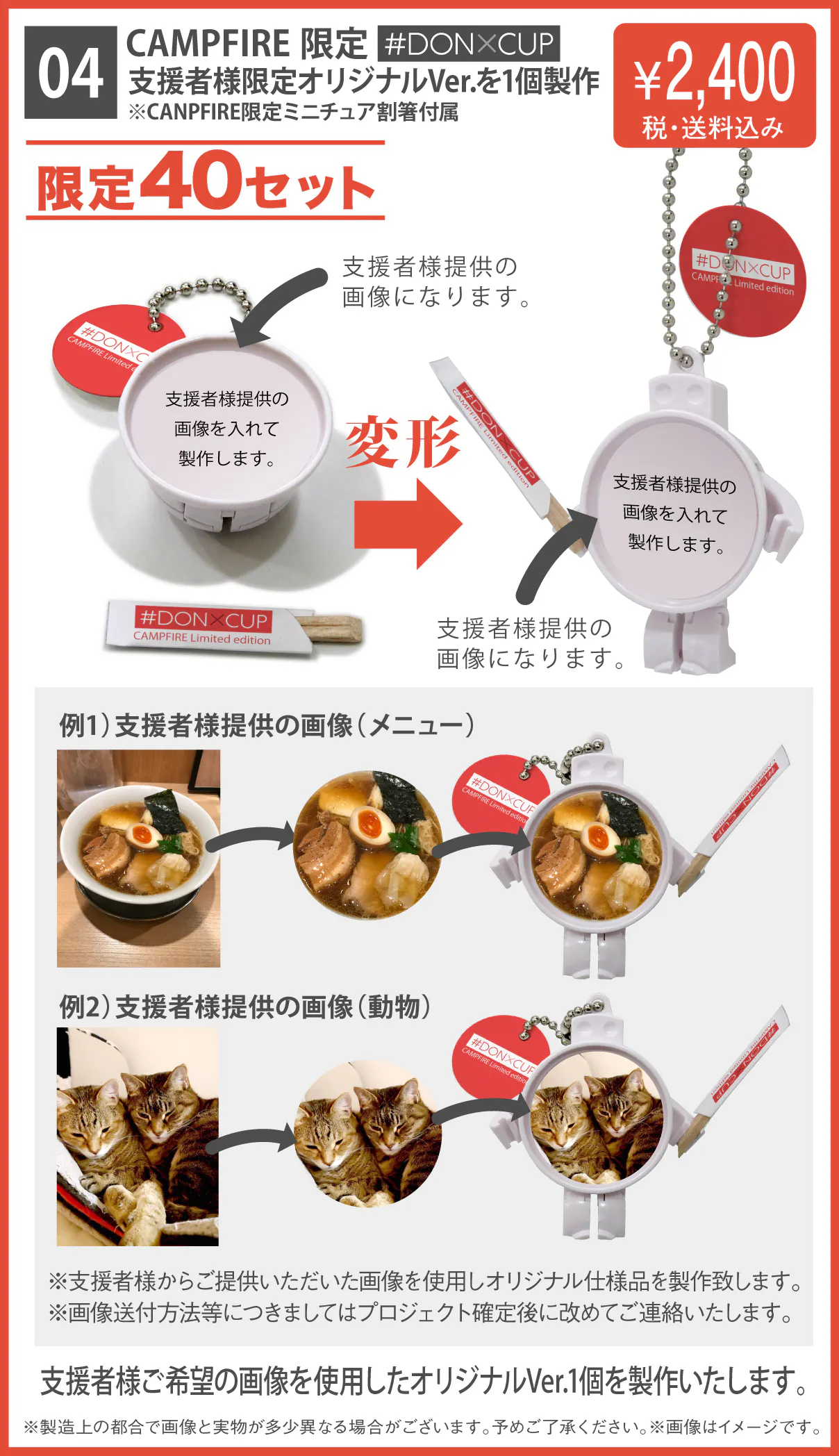 写真を変えて自由にデザインを替えられる『#DONXCUP』の可能性は無限大です。日本全国のラーメン店様をはじめ、どんぶりメニュー提供店様や「麺・丼愛好家」の皆様とのコラボ・タイアップをしたいと考えています。もちろん飲食店事業者様以外でコラボ・タイアップしていただける協力先の募集もしています。手始めとして本プロジェクトでは『#DONXCUP』可能性を活かしたオリジナル品が作れるリターン(【04】、【05】、【07】)を提供しています。