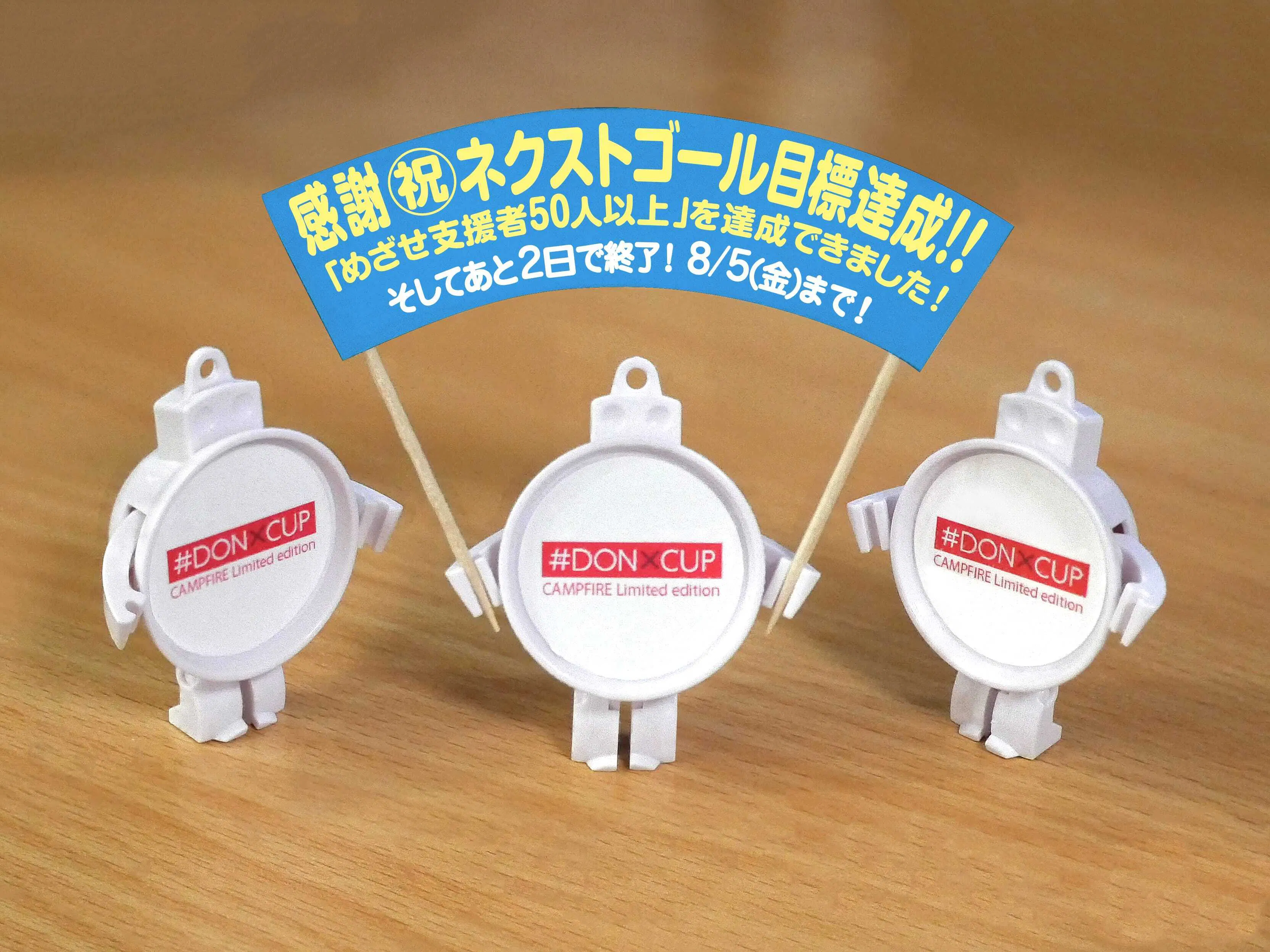 ネクストゴール目標【めざせ支援者50人以上】を達成致しましたが、1人でも多くの方のおてもとに「#DONXCUP」をお贈りすることができると幸いに思っています。プロジェクトの終了まで短い期間ではありますが、更に多くの方に賛同いただけるよう頑張りたいと思います。