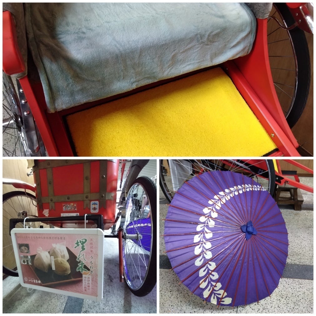 人力車はまだ届いてませんが、付属品などは続々準備中です。ひざ掛け。マット。予定には無かったけど黄色をチョイスしました。傘。藤の模様、風のない日に使用したいです。これも予定には無かったです。看板。支援者の看板広告。一番良い方法を模索中です。