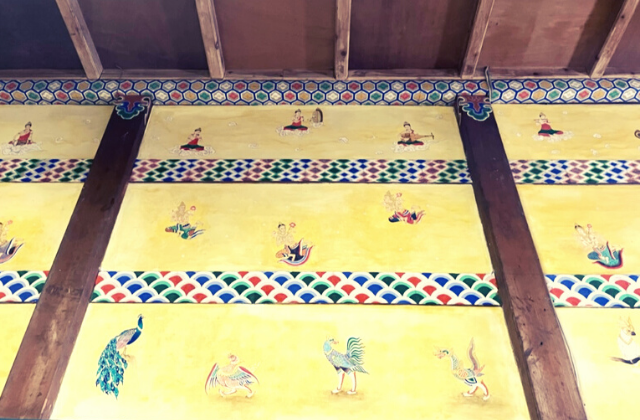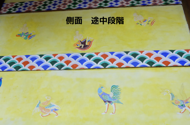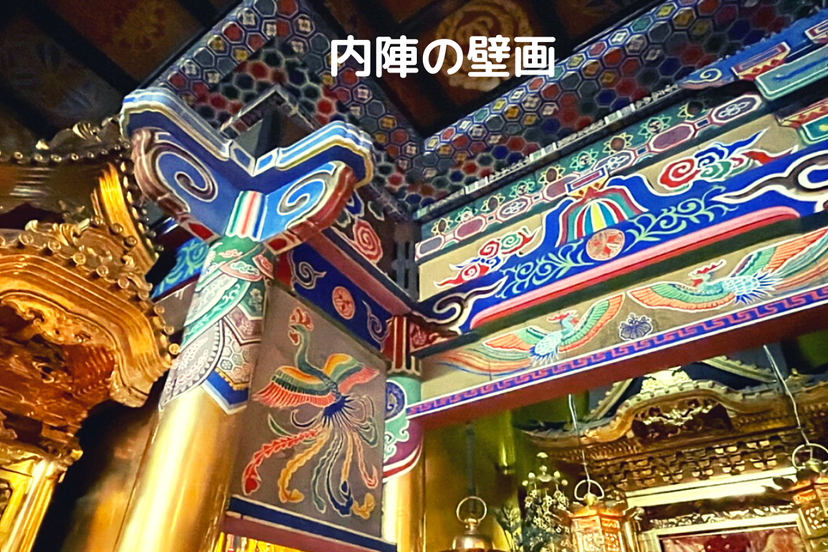 内陣の正面の上部の壁画は、祖父と父の共同制作です。色鮮やかに鳳凰や雲、七宝紋、植物などが表現してあります。