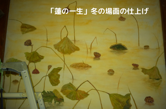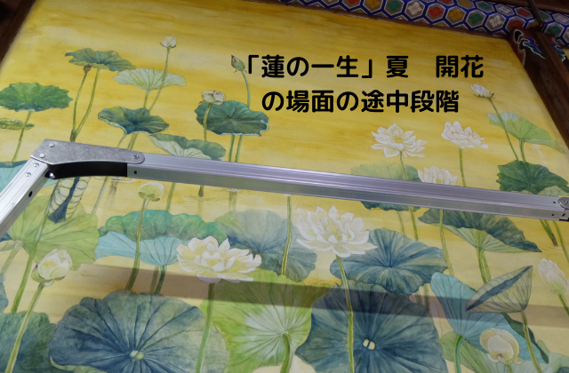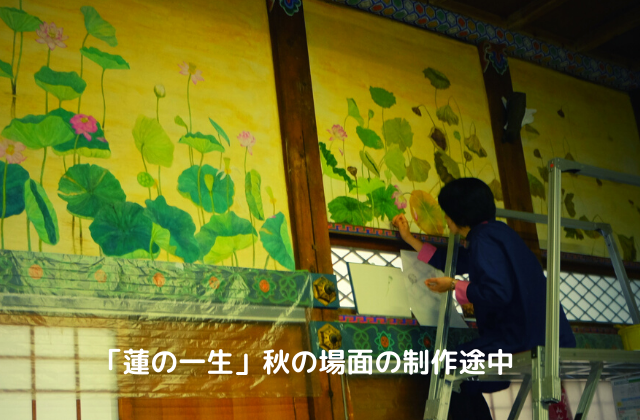 日本の絵巻など横長の画面では、右から左へ時間の経過を表します。陰陽五行説や雅楽では方角を季節であらわし、東が春、南が夏、西が秋になります。丁度内陣に向かって右が東であり、1面目から春の芽吹きから夏を経て、左の6面目が西で晩秋の枯れ朽ちた蓮になるようにしました。西は西方浄土、極楽浄土でもあります。6面を通して「生老病死」を表現したいと思いました。
